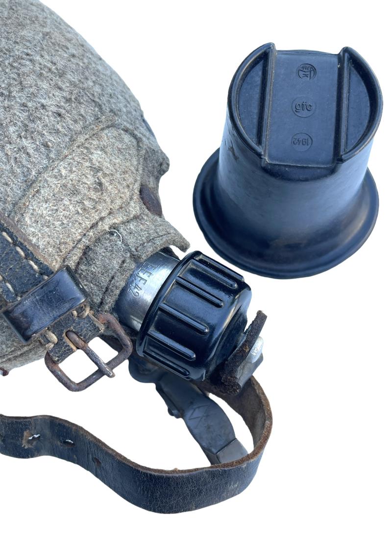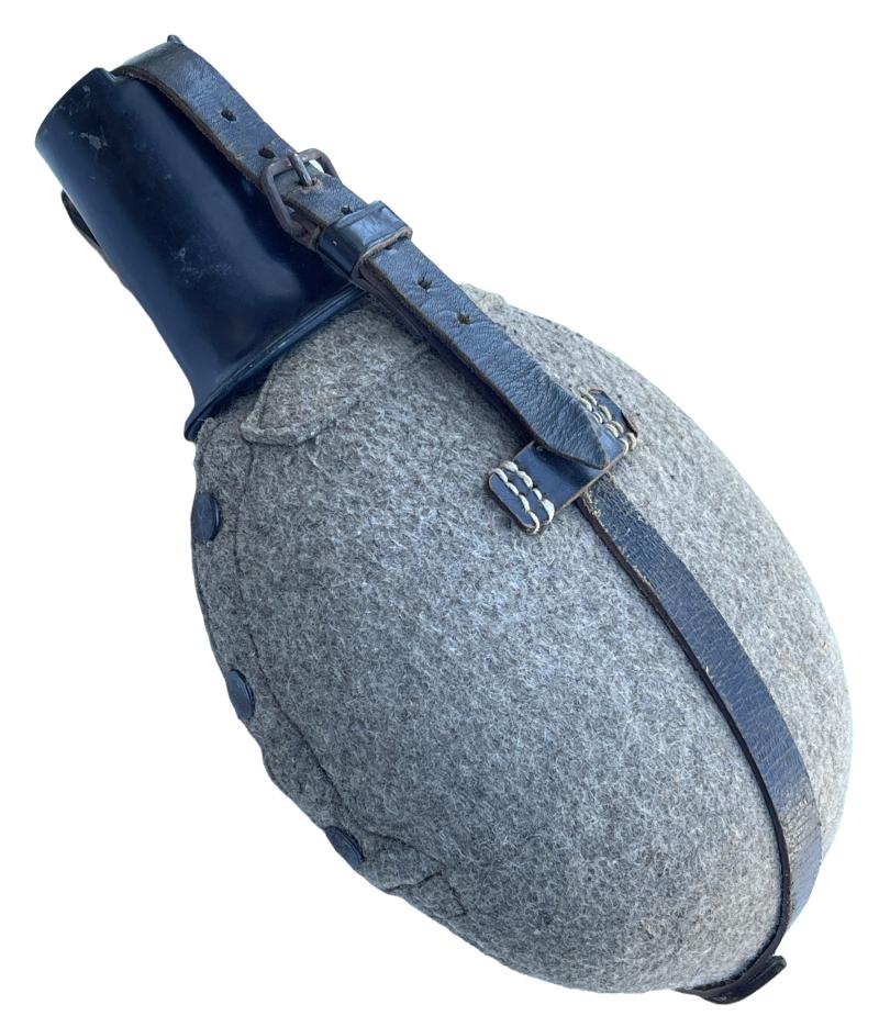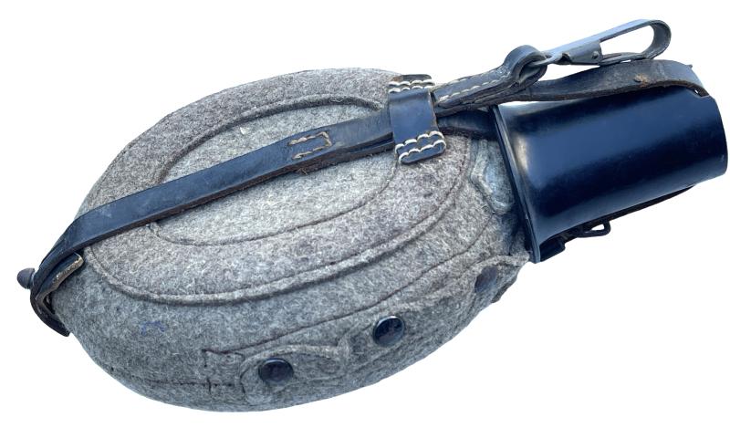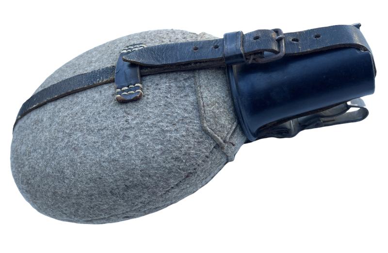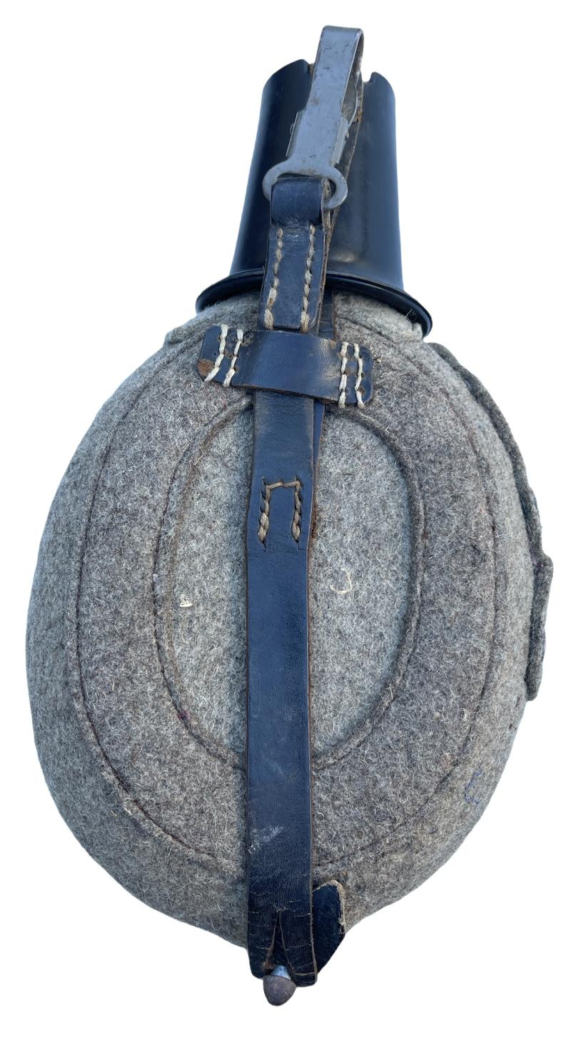 Wehrmacht M31 Canteen Aluminum made canteen with felt cover with leather straps and Bakelite cup Overal a nice used canteen in very good condition. Perfect to complete Wehrmacht equipment!