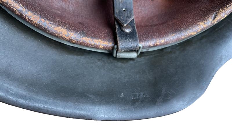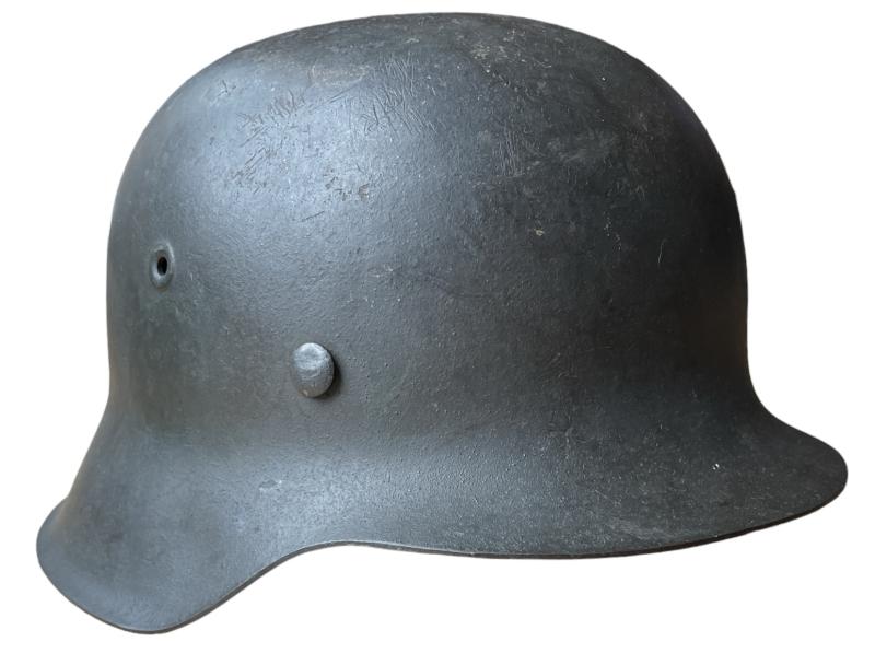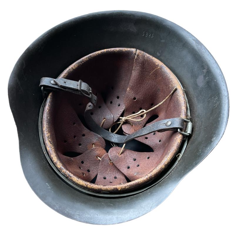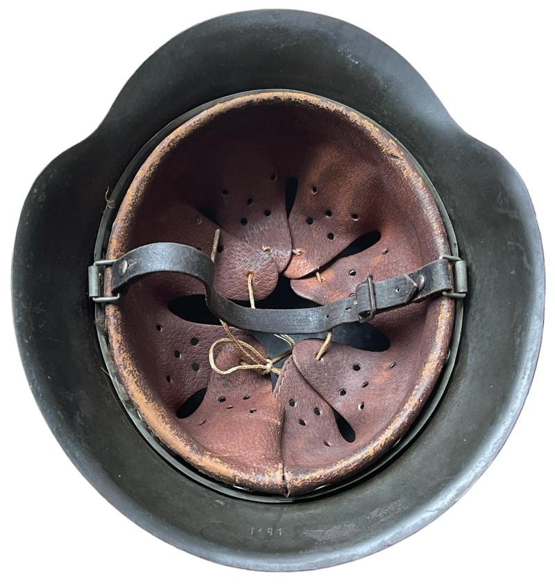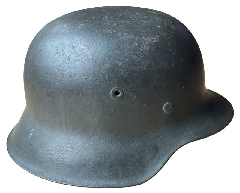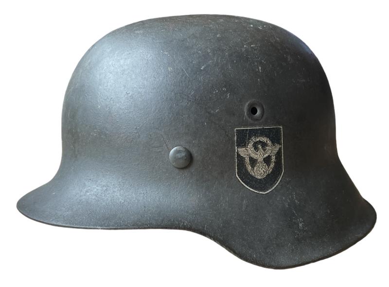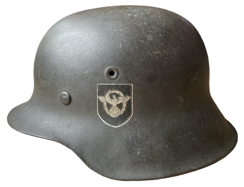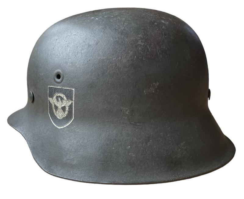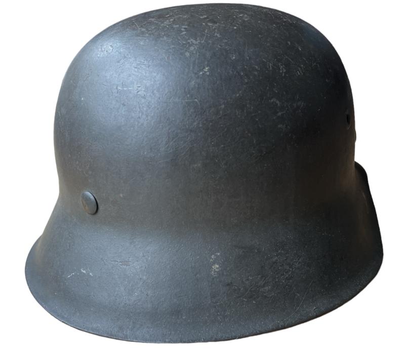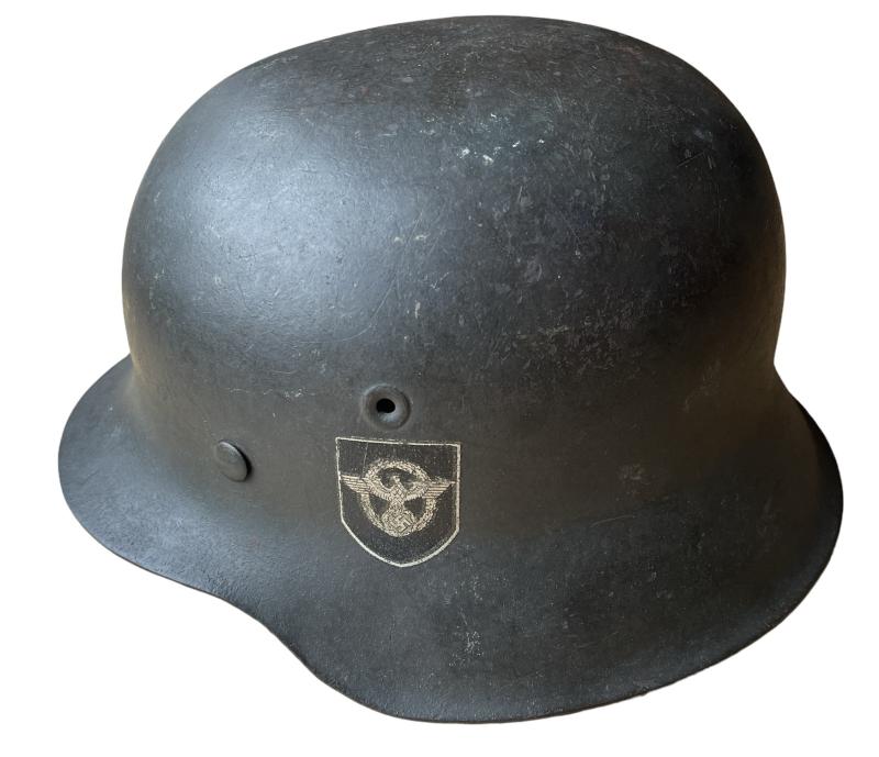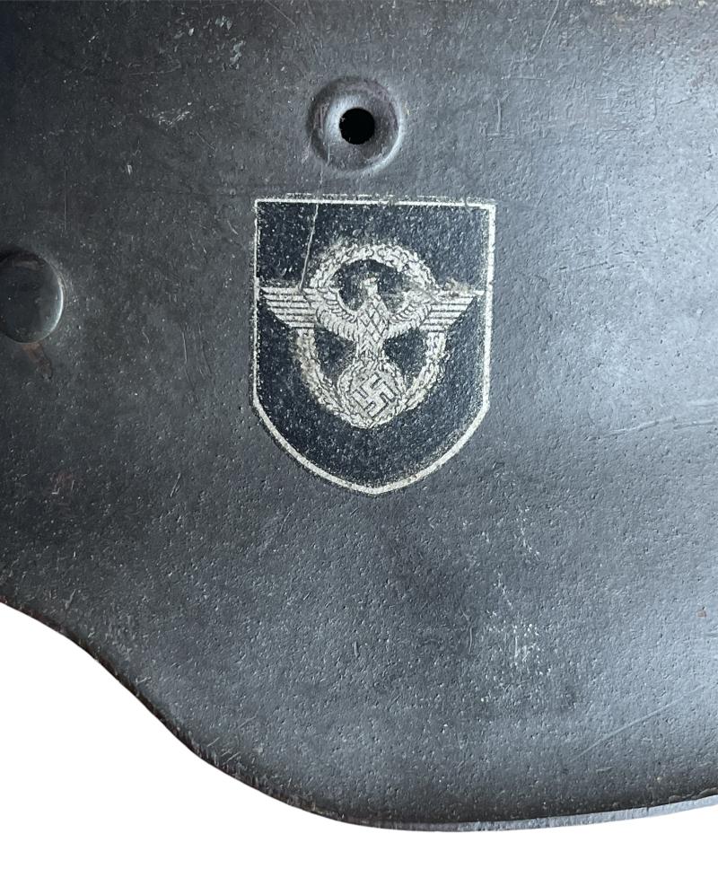 Very nice used but outstanding combat “Polizei” M42 SD helmet. Maker code marked “ET” which is “Eisenhuttenwerk Thale” in size “64” with its original liner in size “56/57” and original liner string.