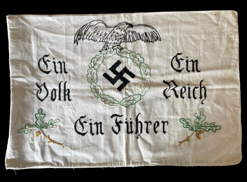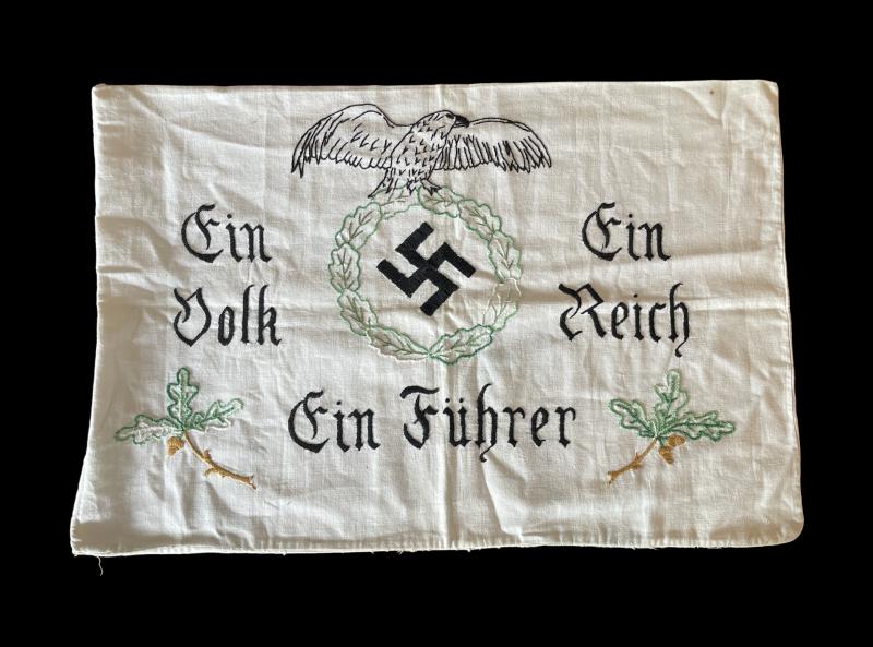 Third Reich Patriotic Pillow Cover Hand made Third Reich “Patriotic” pillow cover “Ein Volk, Ein Reich, Ein Fuhrer” In used but very good condition.