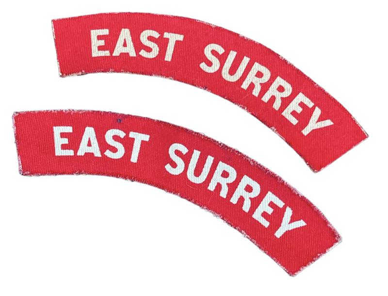 Very nice pair printed British WW2 “Regimental” cloth shoulder insignia “East Surry”. Overal in used but very good condition. Great to complete a nice British WW2 Battle Dress.