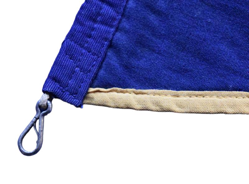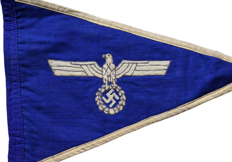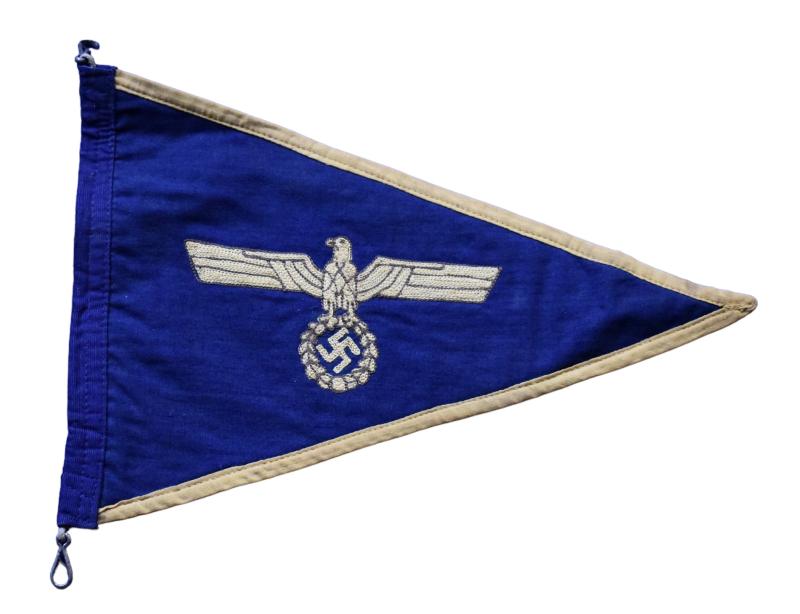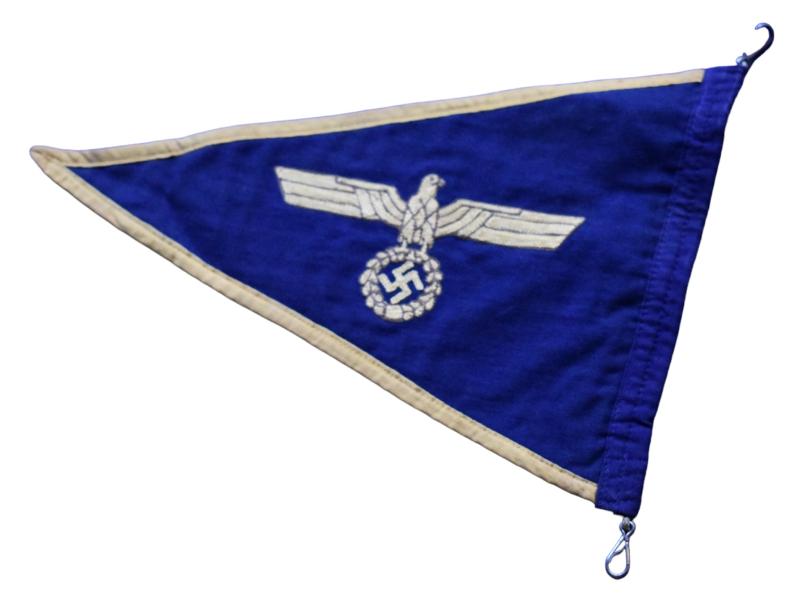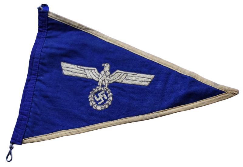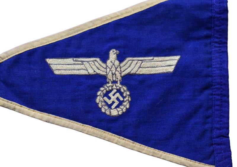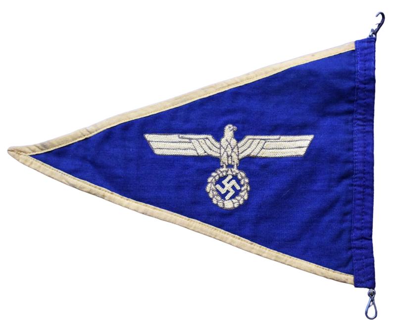 With the embroidered Kriegsmarine eagle on both sides of the pennant. The pennant is complete with both original attachment hooks of which one is missing a small part. Overal a very nice and decorative Kriegsmarine car pennant in used but very good condition.
