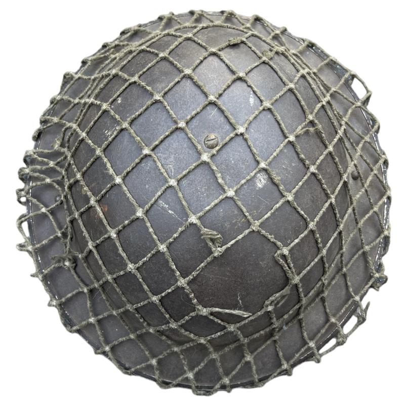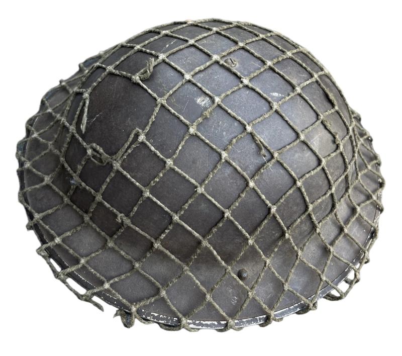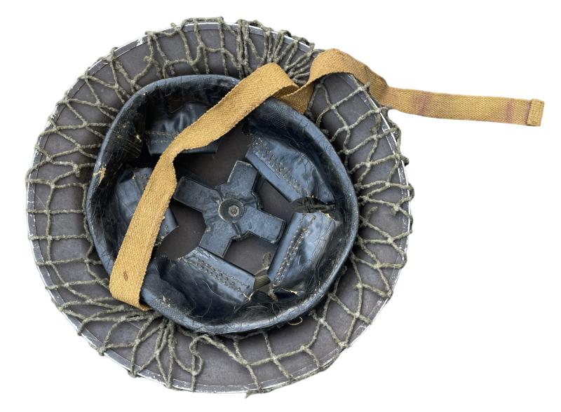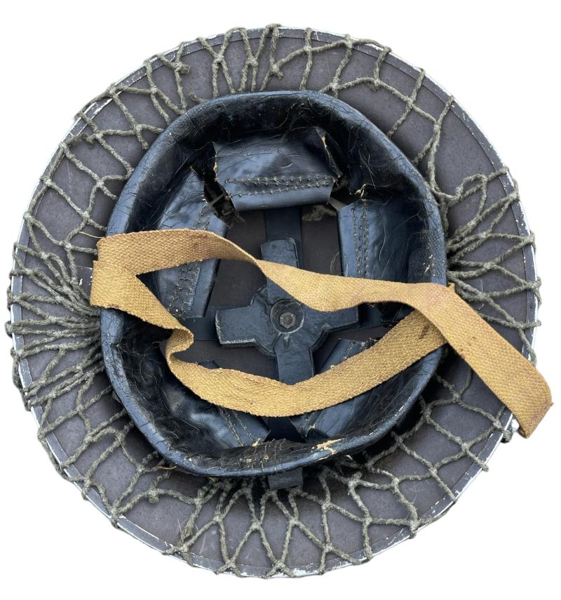 The helmet has a nice second type helmet strap. Overal a fabulous British WW2 “Brodie” helmet with original camo net in used but very good condition.