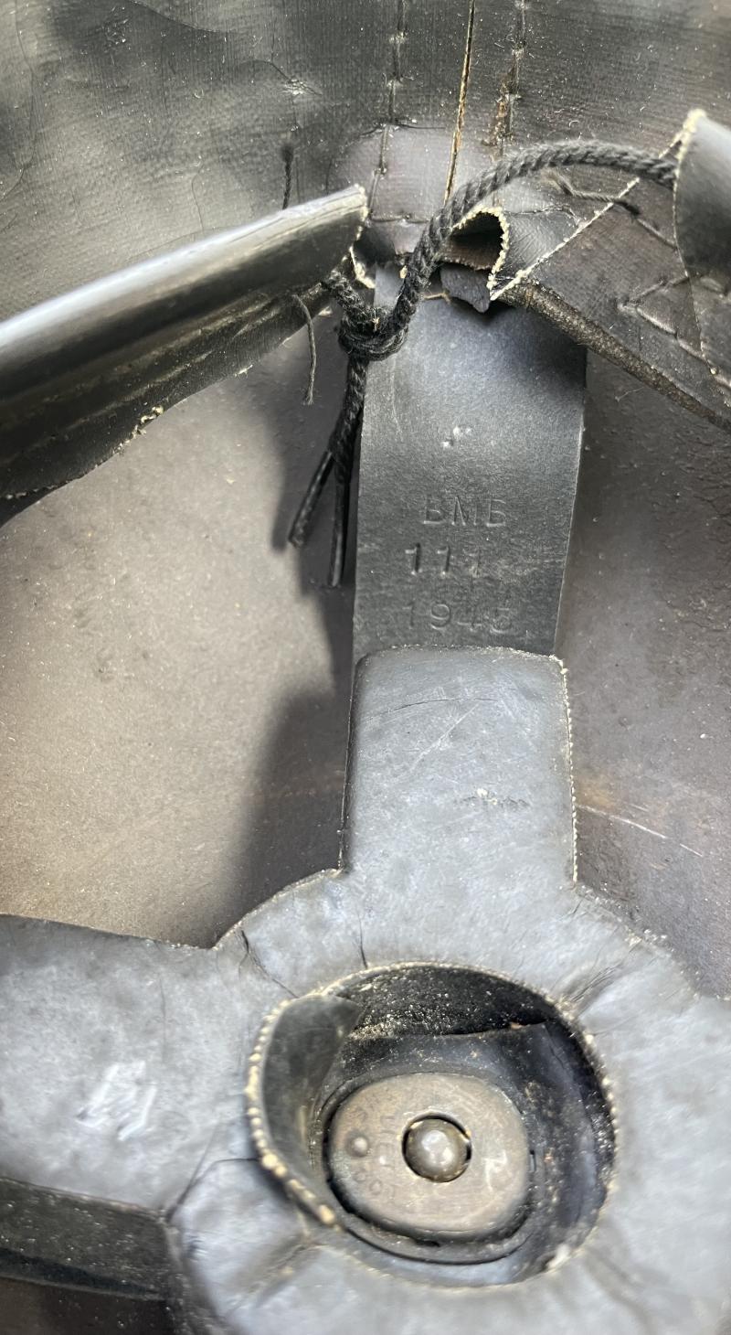 With its original liner maker marked “BMB” (Briggs Motor Bodies” and dated “1945” and with its second model helmet strap.