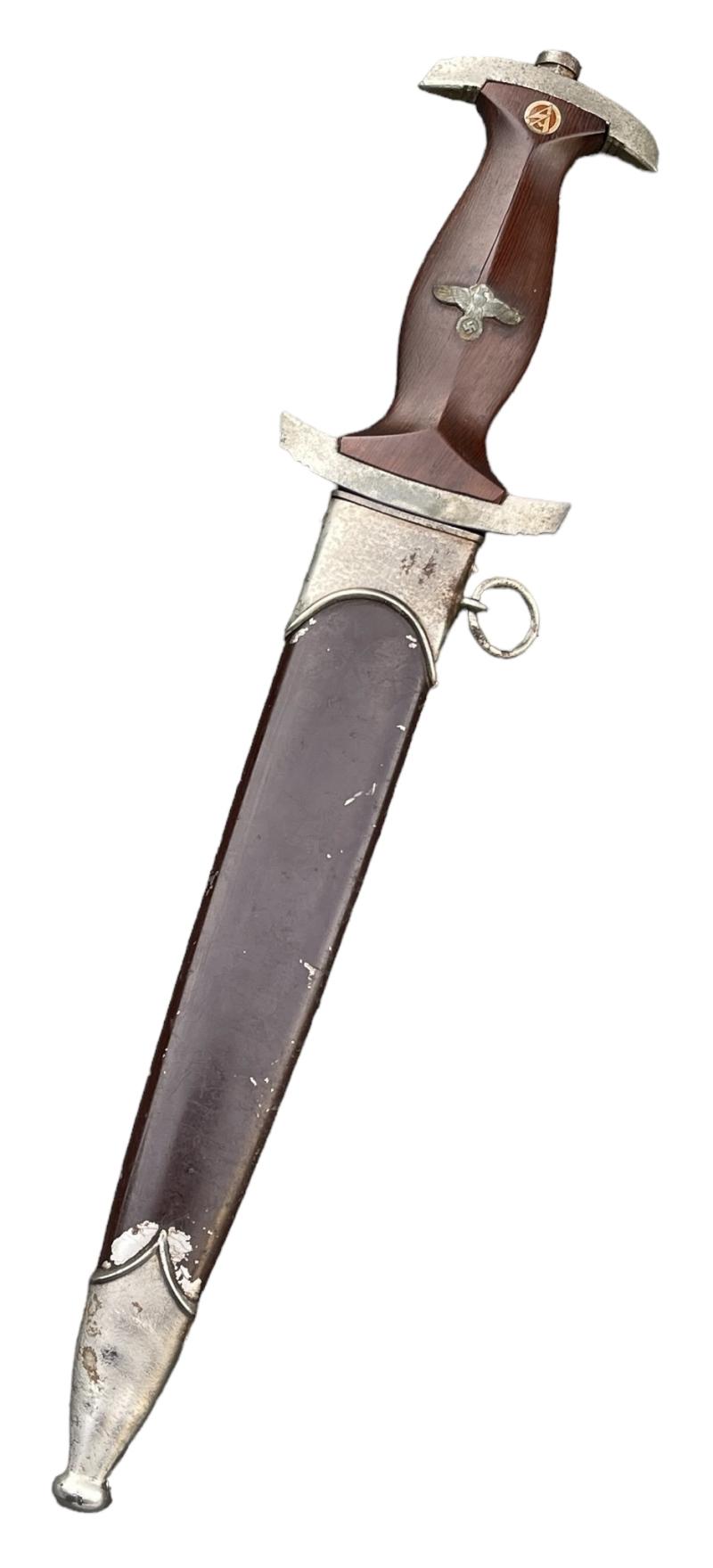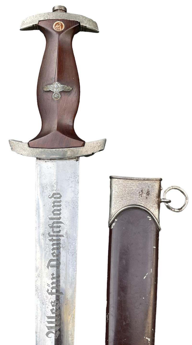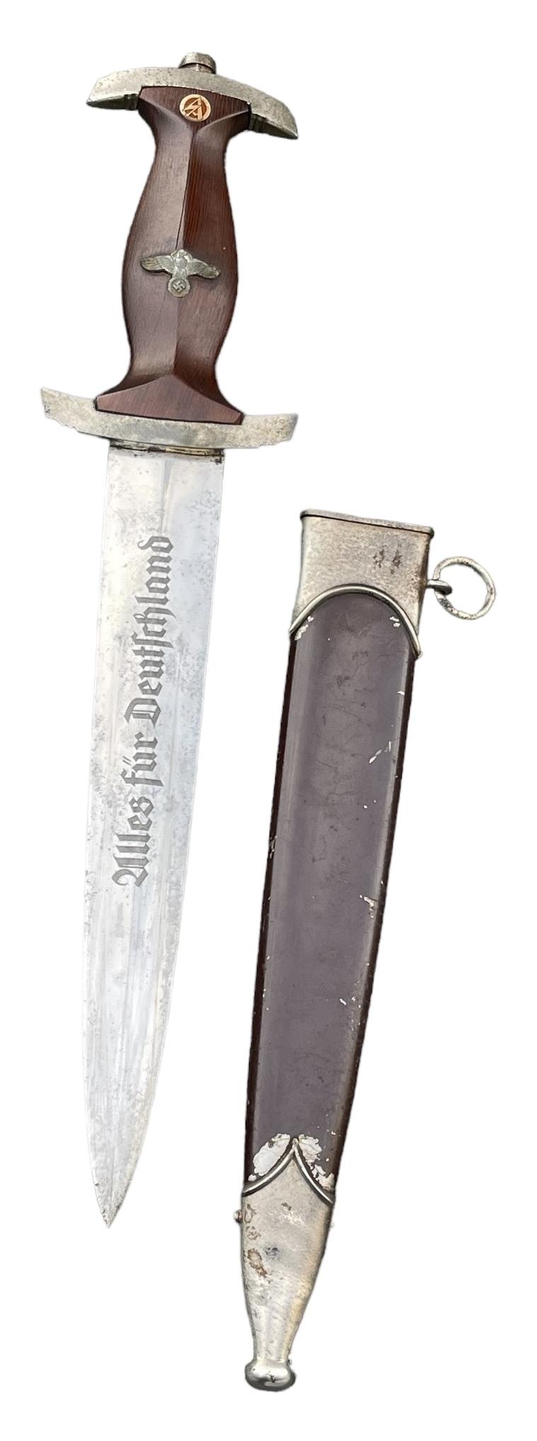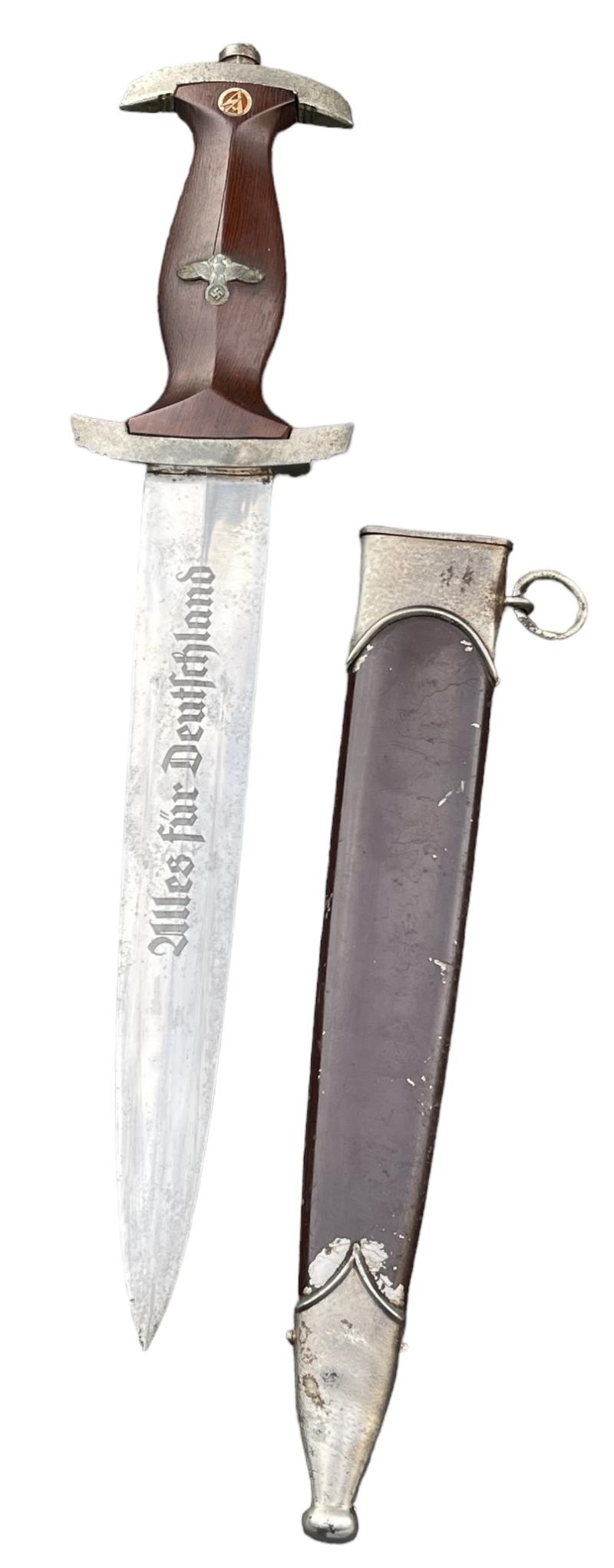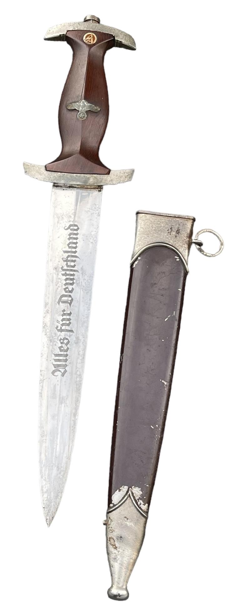 SA Dagger Late war used SA dagger, with its original metal scabbard. With motto “Alles für Deutschland” Dagger is “RZM M7/36” marked Which is “E.&F. Horster, Solingen” Overal a used dagger in good condition.