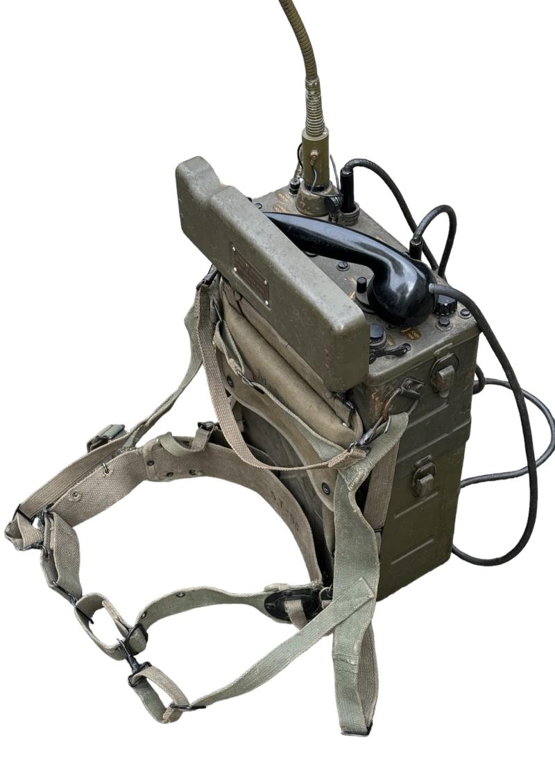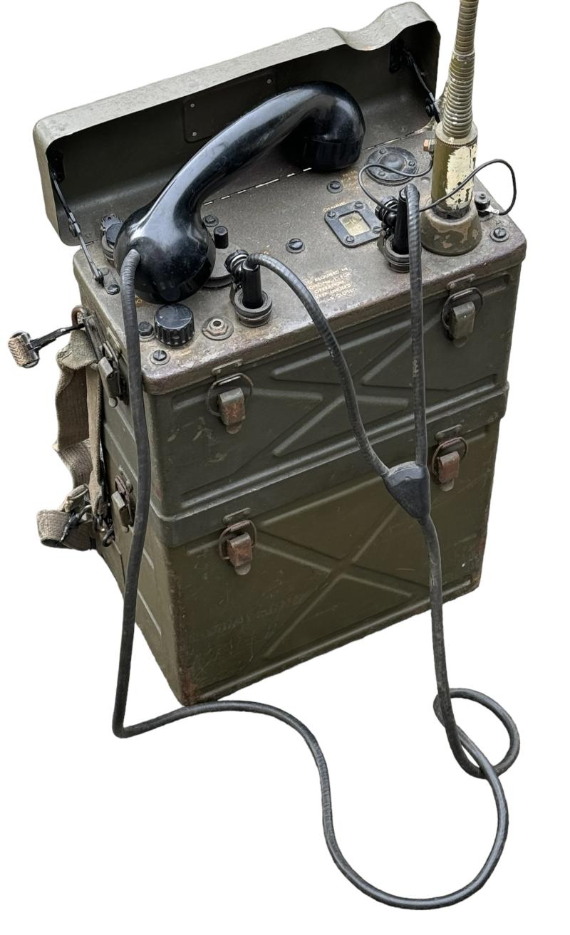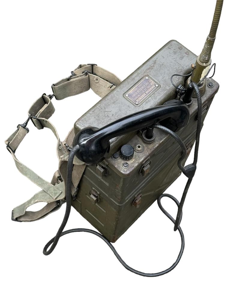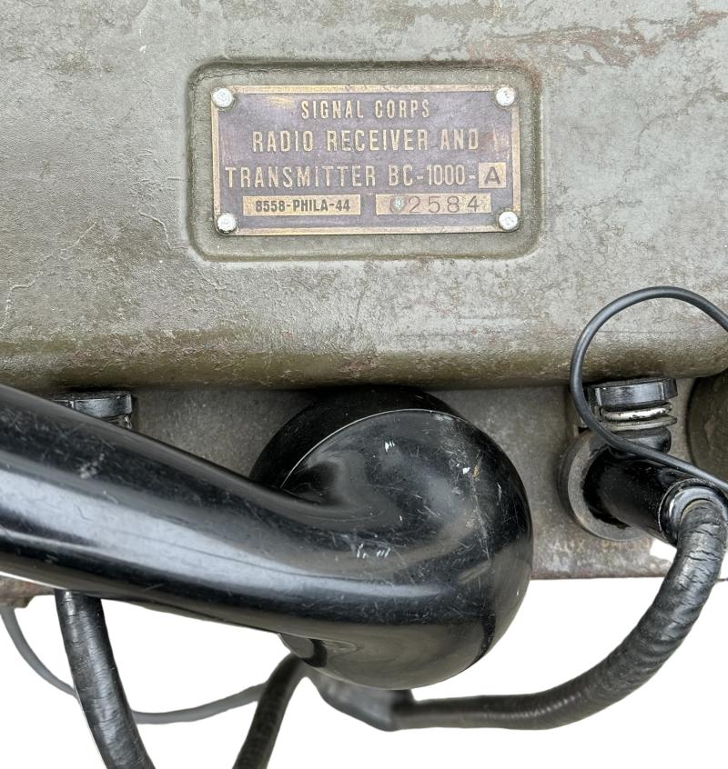 Very nice used US WW2 Signal Corps “BC1000 A” transmitter/receiver for combat field use, complete with handset, troat microphone, antenna and carrying frame. Dated “1944” fantastic for a signal corps display or very nice and decorative on a combat radio operator mannequin! In used but good condition.