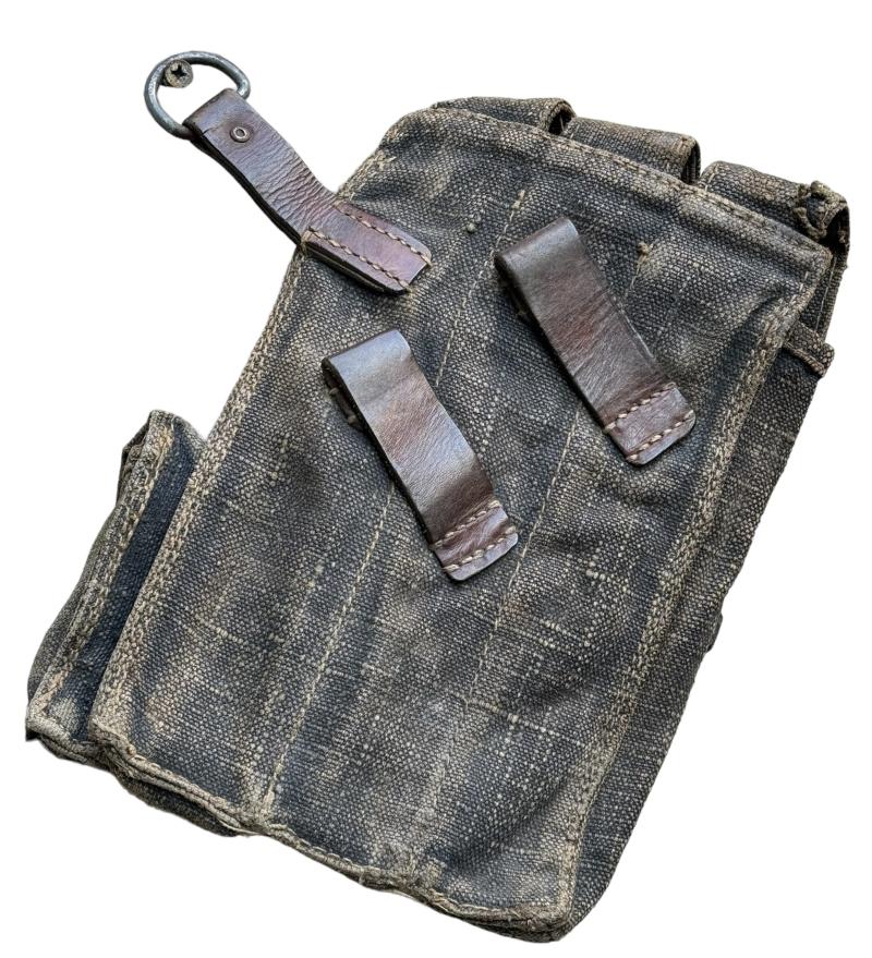 Nice used MP38/40 magazine pouch (left side) with speedloader pocket. Pouch would carry 3 magazines 32 rounds each and the speed loader.