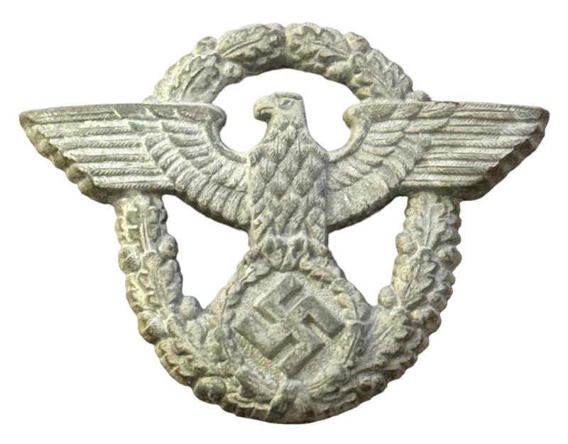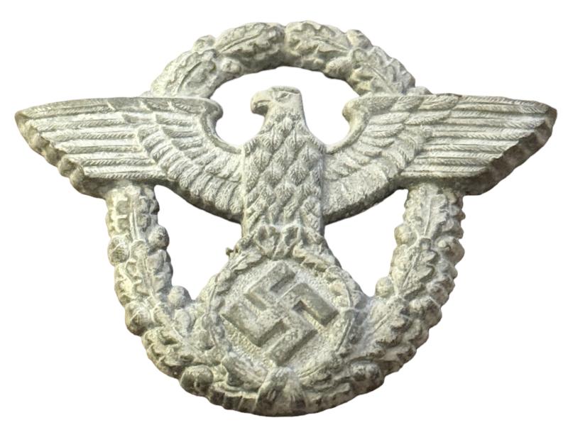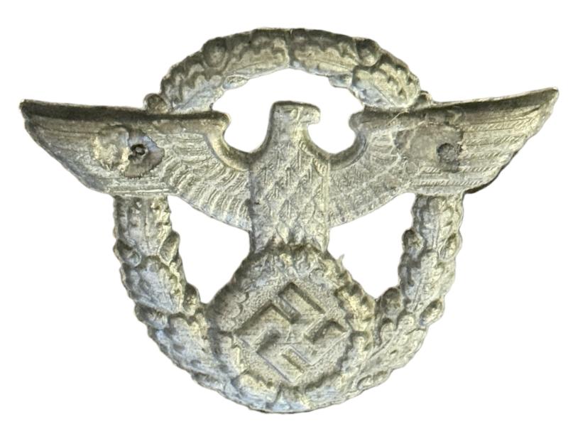 Polizei metal Cap Eagle Nice used metal “Polizei” cap eagle. Unfortunately its prongs are missing. Still very nice for decoration.