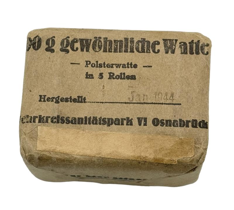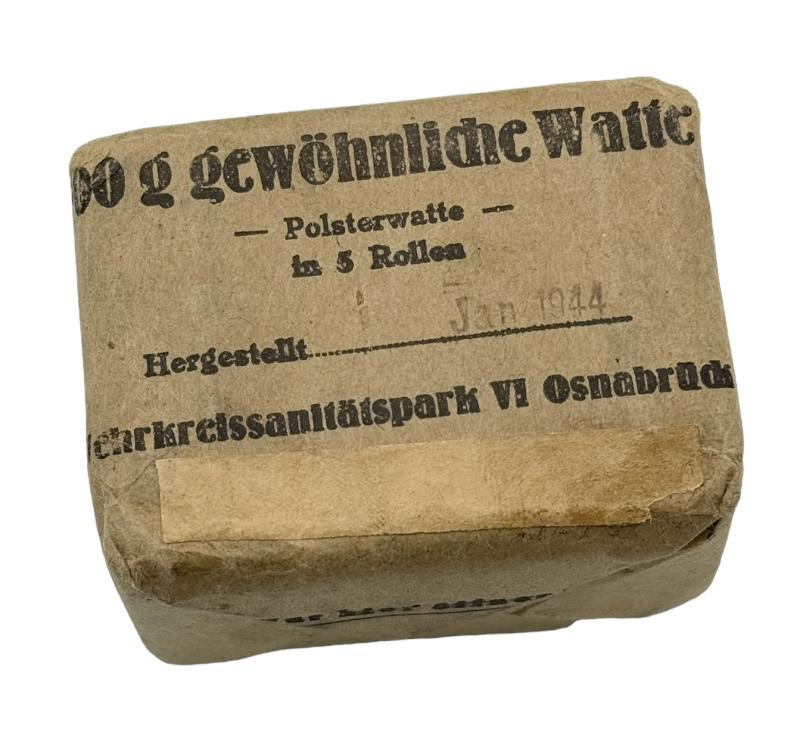 Wehrmacht Medical Bandage Pack “20 Gram Gewöhnliche Watte” Marked “Lehrkreissanitätspark VI Osnabrück” Dated “January 1944” never being opened. In very good condition, nice for a medical display!