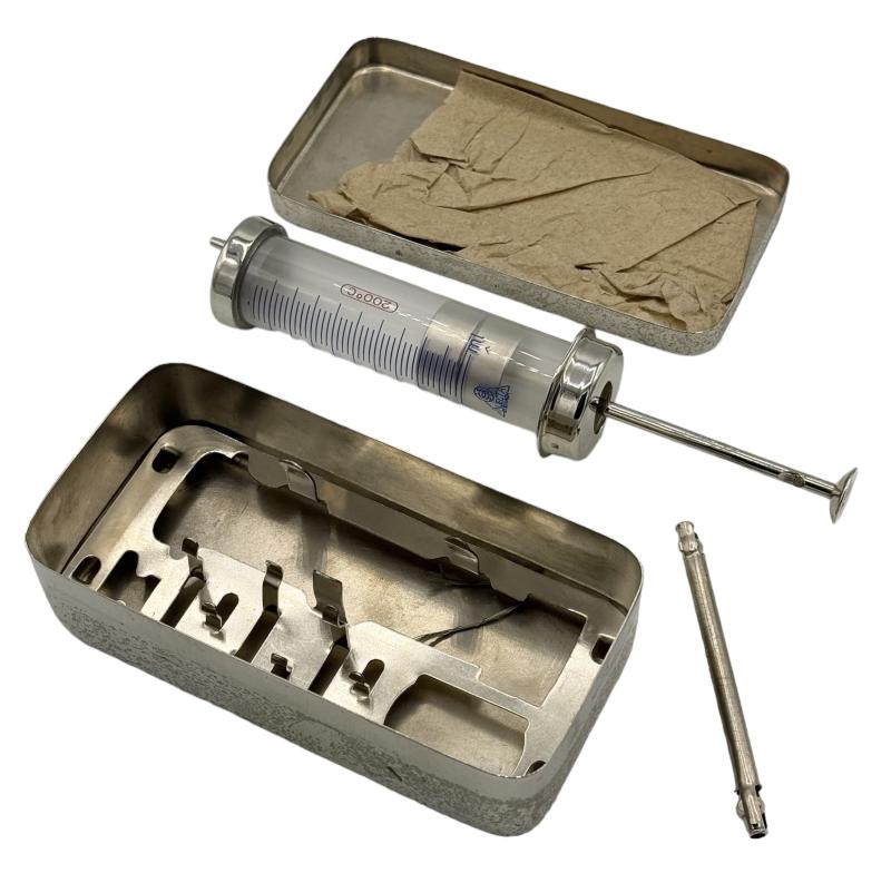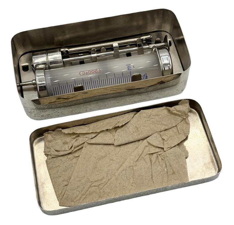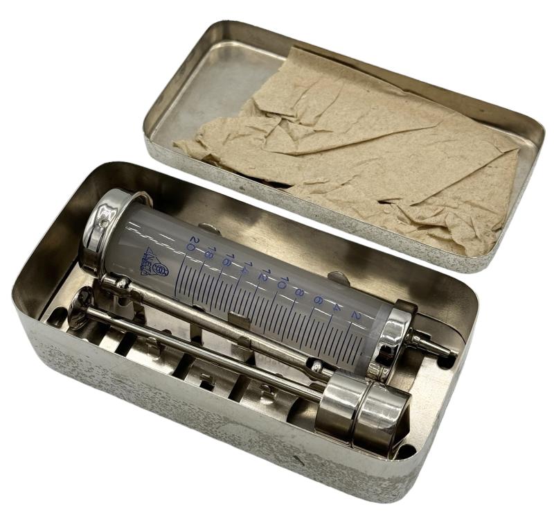 Wehrmacht Medical Syringe Very nice high quality made Wehrmacht medical syringe in stainless steel case. Used by Wehrmacht medical personnel. In very good condition. Great for a medical display!