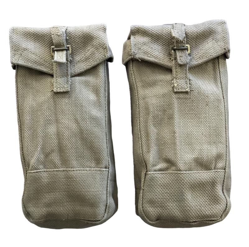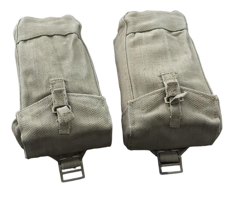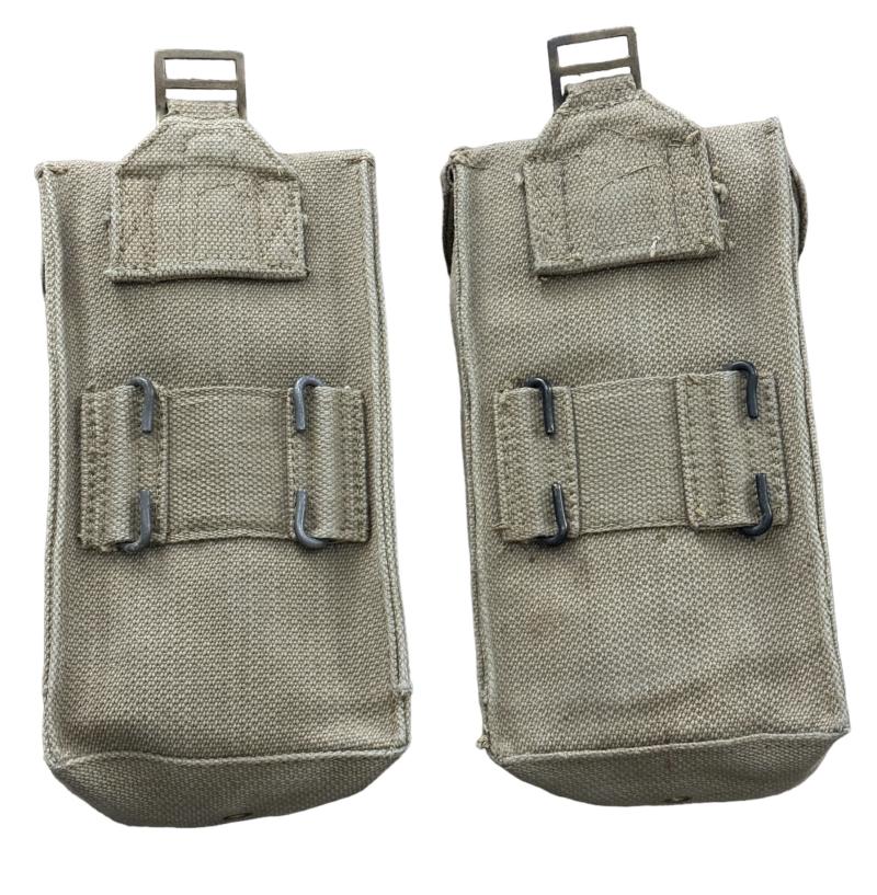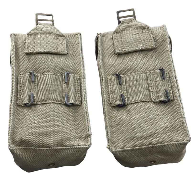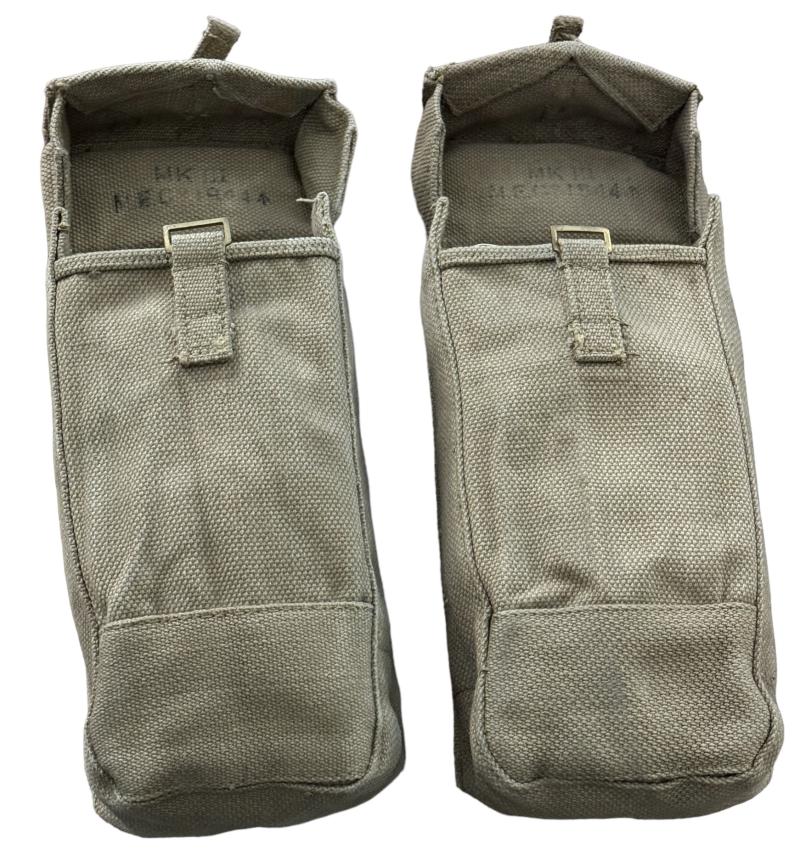 Very nice mint condition British WW2 basic pouches set. Both maker marked “M.E.Co.” and both dated “1944”. Basic pouches are used to carry, 2 inch mortar rounds, Brengun magazines, grenades (Mills Bombs) etc. etc. Overal a fantastic pair of British WW2 basic pouches in outstanding condition.