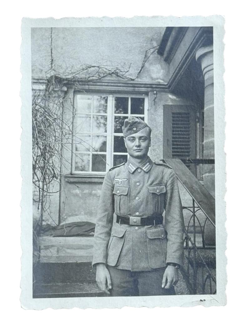 Photograph Wehrmacht Soldier Very nice small size photograph of a Wehrmacht soldier wearing a nice early M40 style tunic with side cap. In very good condition.