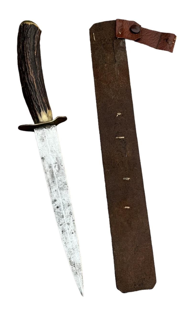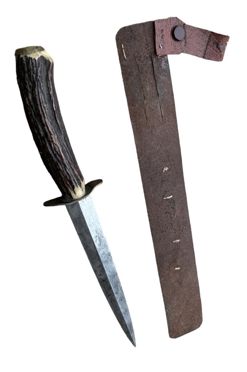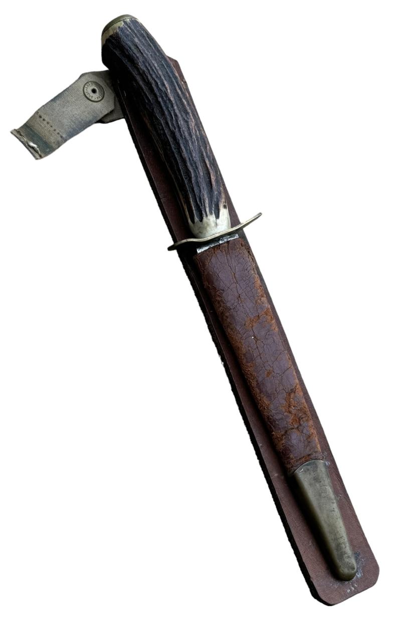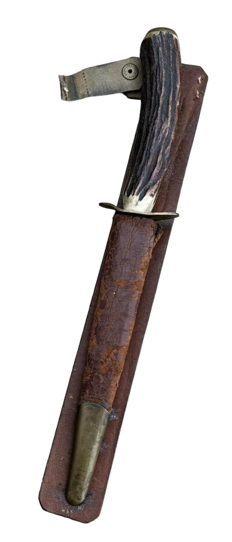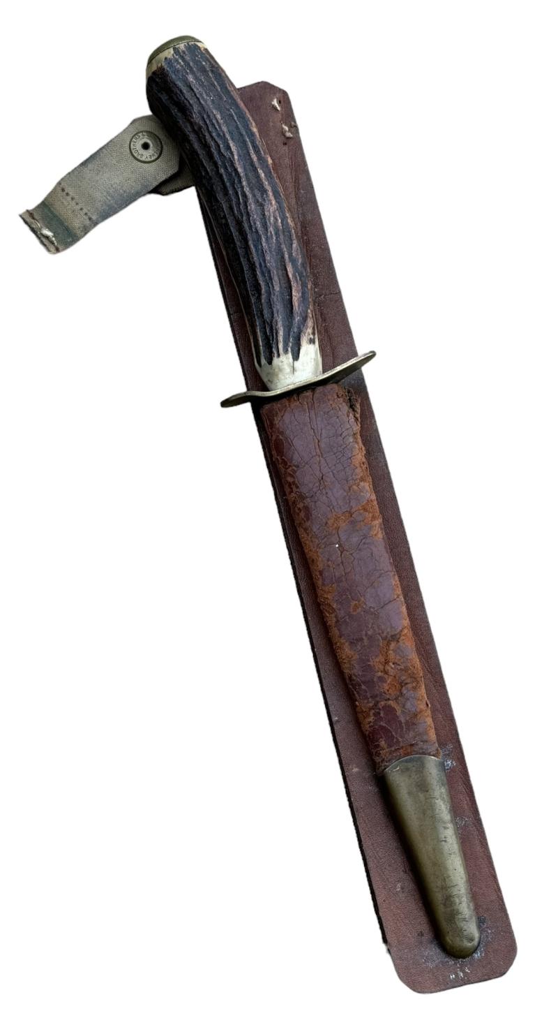 Used but very nice British WW2 FS dagger with personalized deer horn grip and leather scabbard.