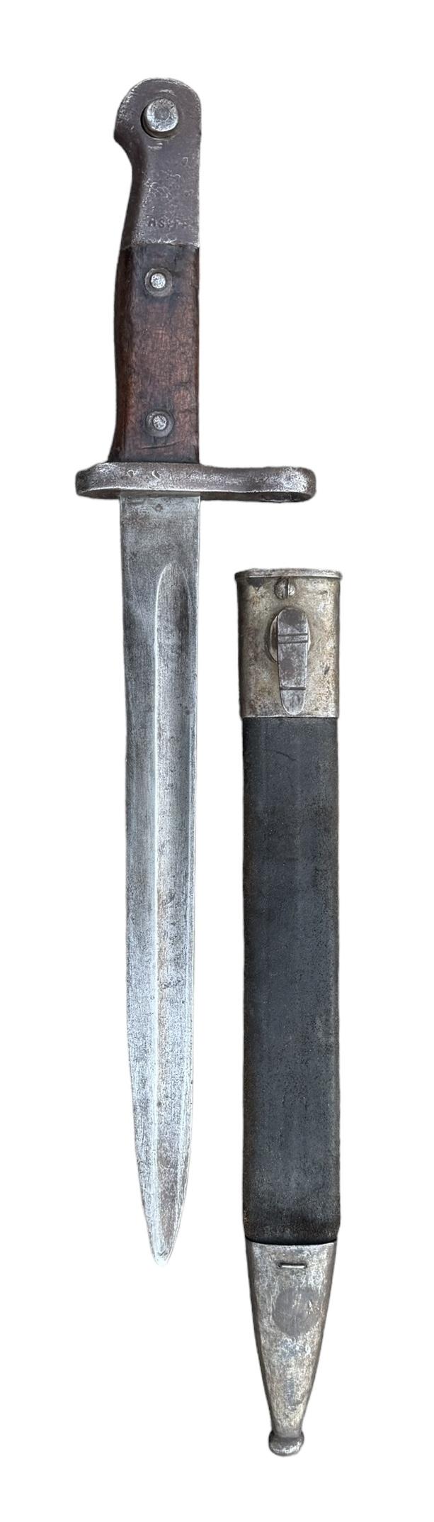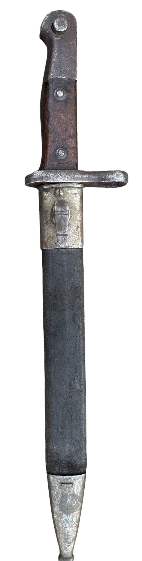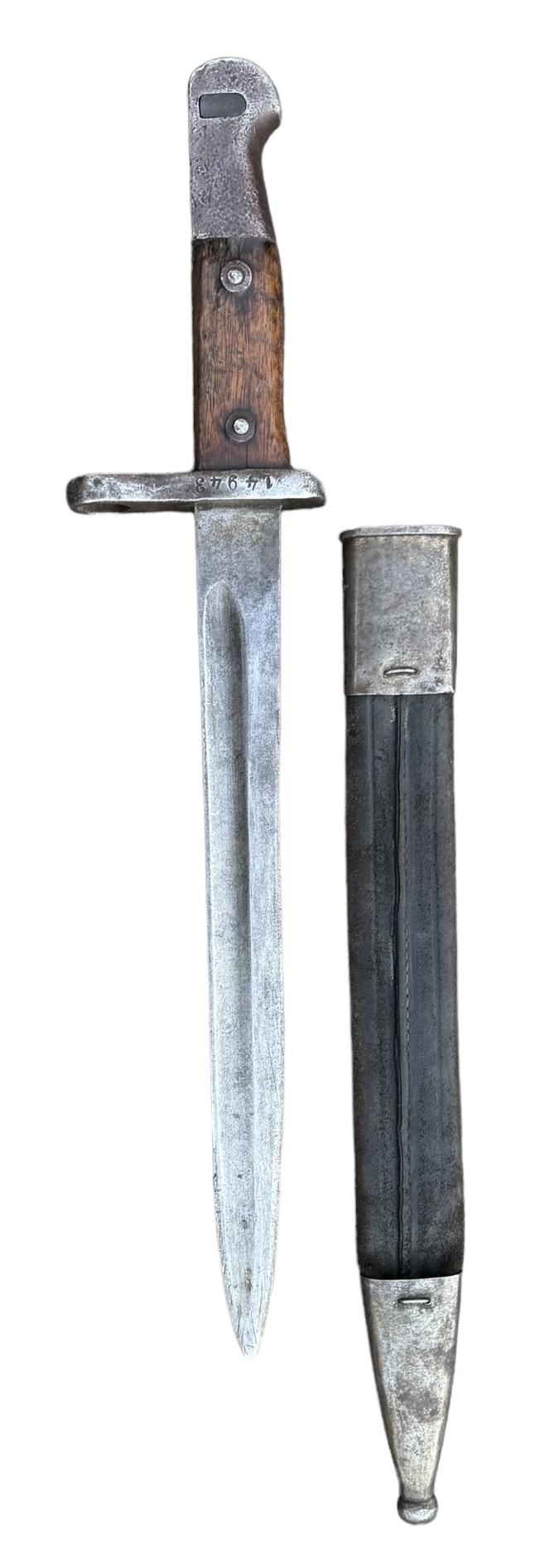 Turkish model 1890 Bayonet Used modified (shortened) Turkish model “1890” bayonet. For the Turkish Mauser model “1890/1893/1903/1905” with its original leather/metal scabbard. In good condition,