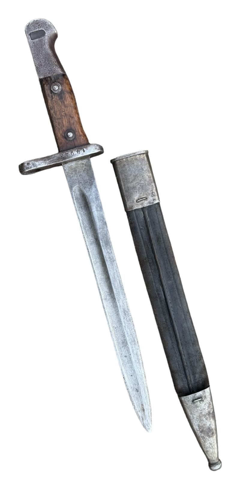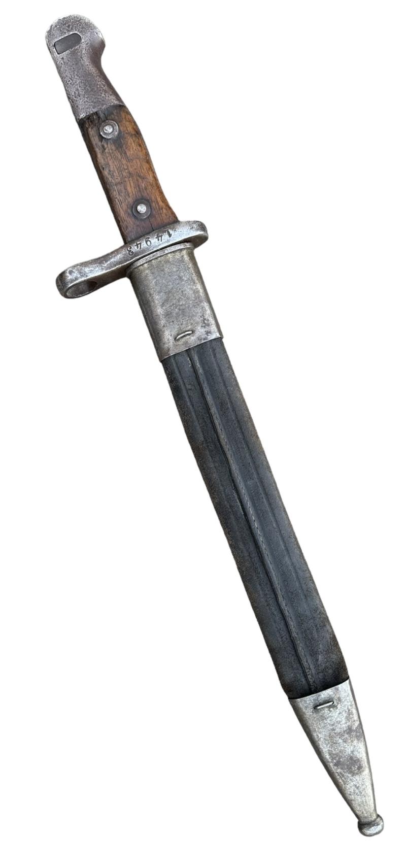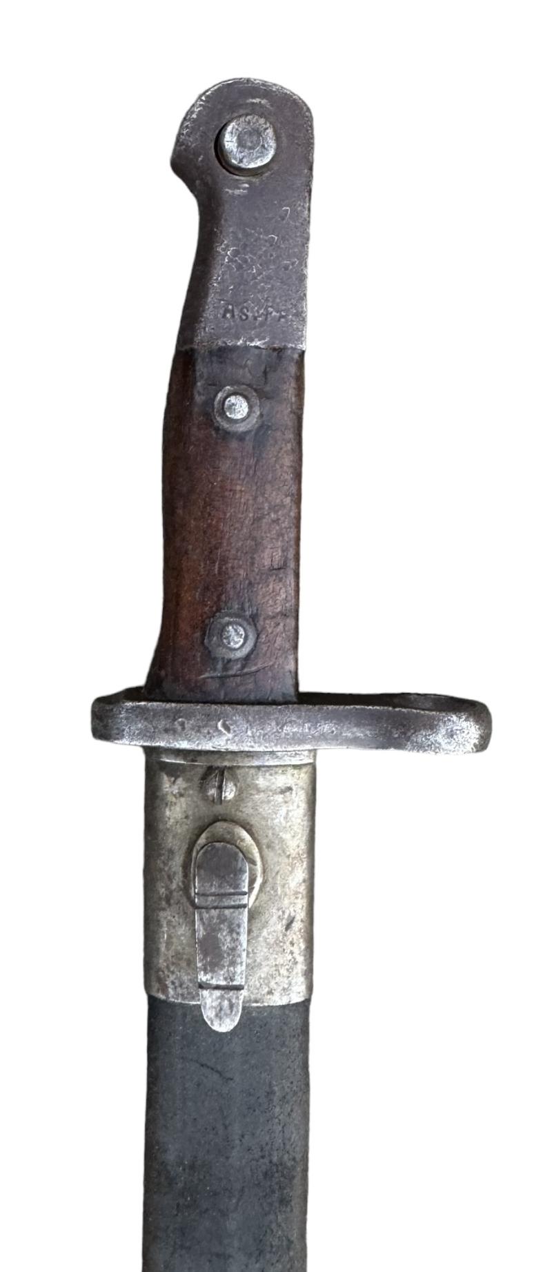 Turkish model 1890 Bayonet Used modified (shortened) Turkish model “1890” bayonet. For the Turkish Mauser model “1890/1893/1903/1905” with its original leather/metal scabbard. In good condition,
