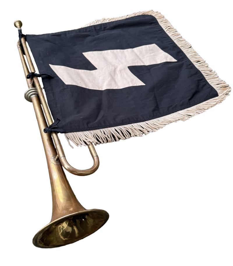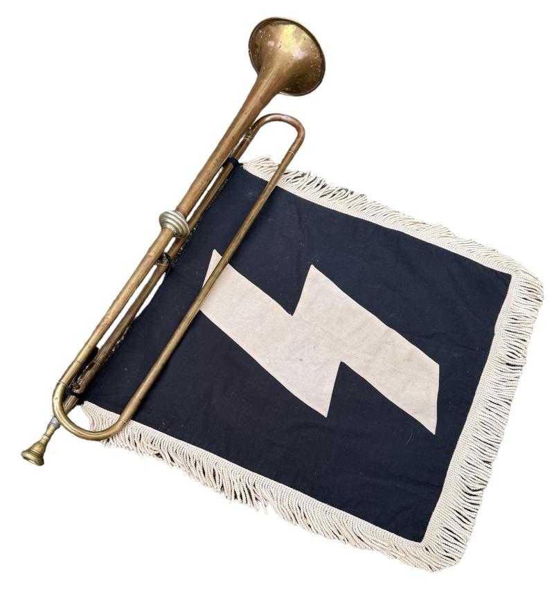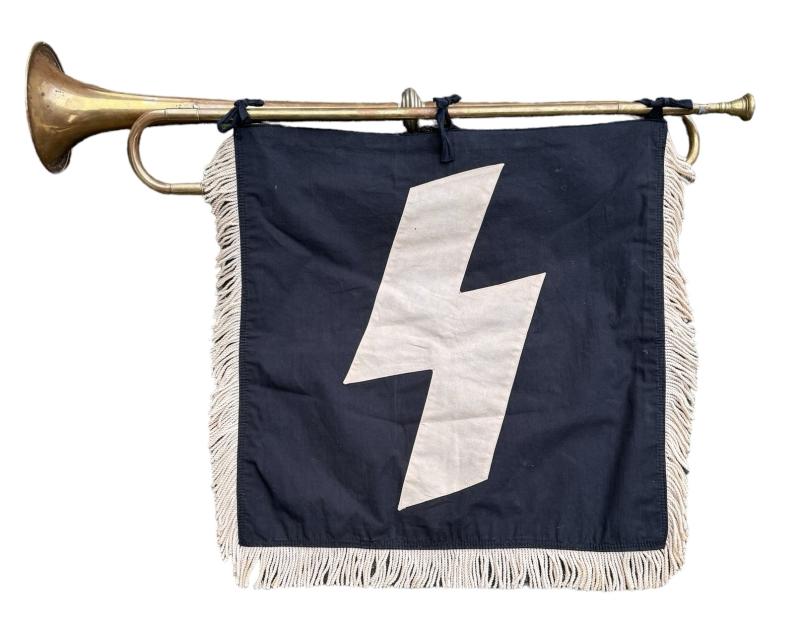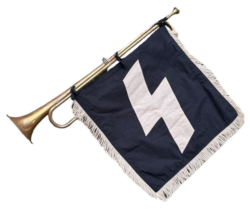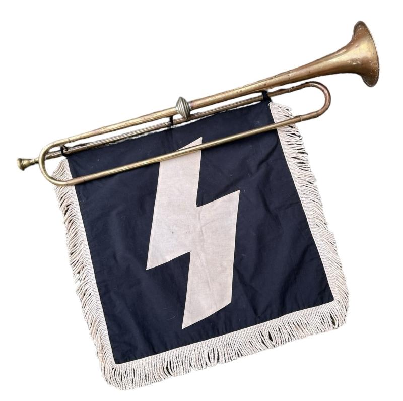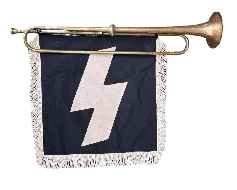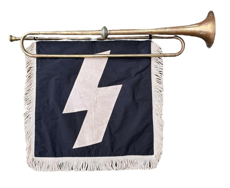 Outstanding DJ Trumpet with dubbel sided single rune sign so-called “Deutsche Jung-Volk” trumpet banner. With its original cloth attachment loops.