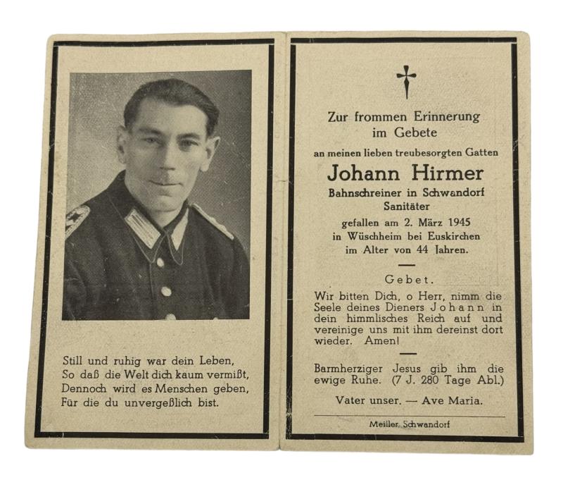 Death notice of Sanitäter (Medic) “Johann Hirmer”