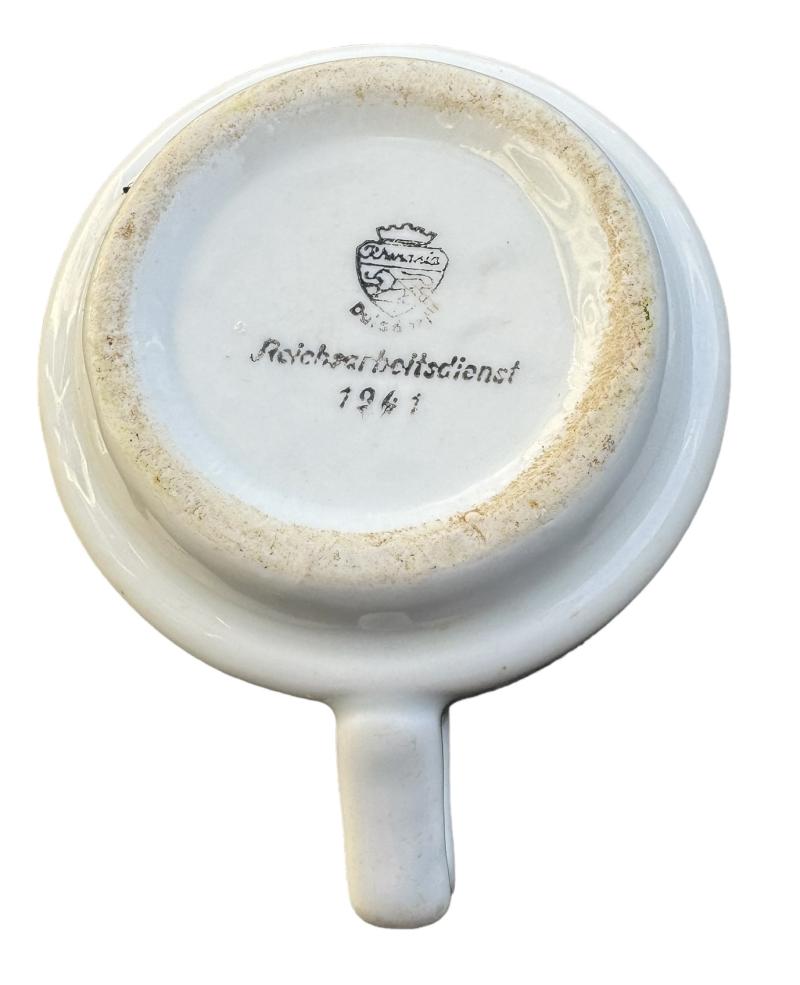 Arbeidsdienst porcelain Coffee Cup Nice used porcelain Third Reich “Arbeidsdienst” coffee cup. Marked “Arbeidsdienst” and dated “1941” Used in Baracks messhalls. In very good condition.