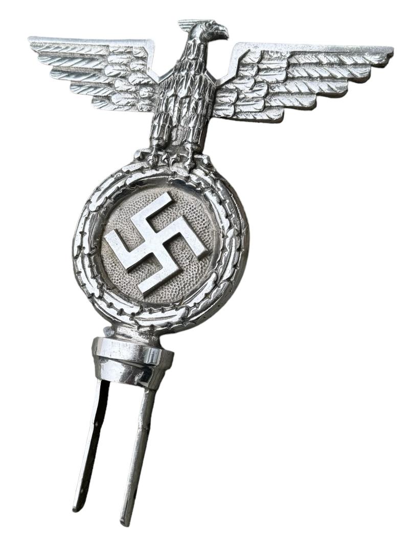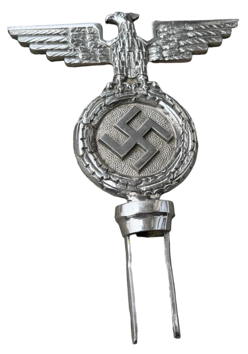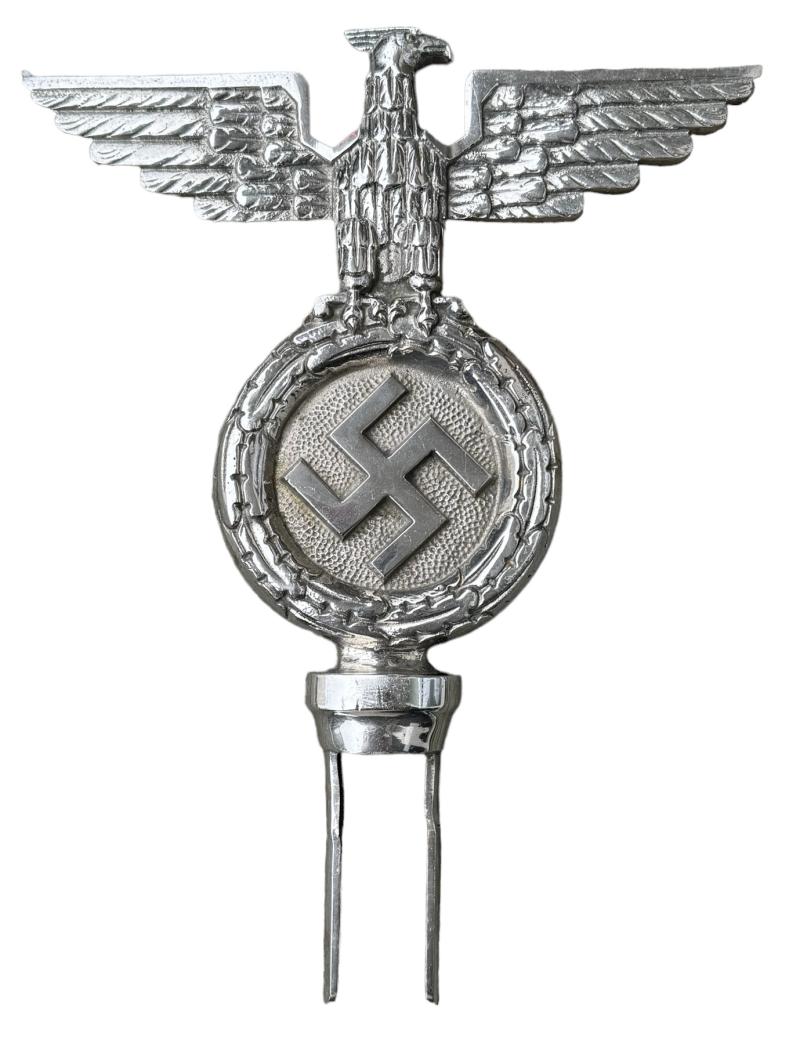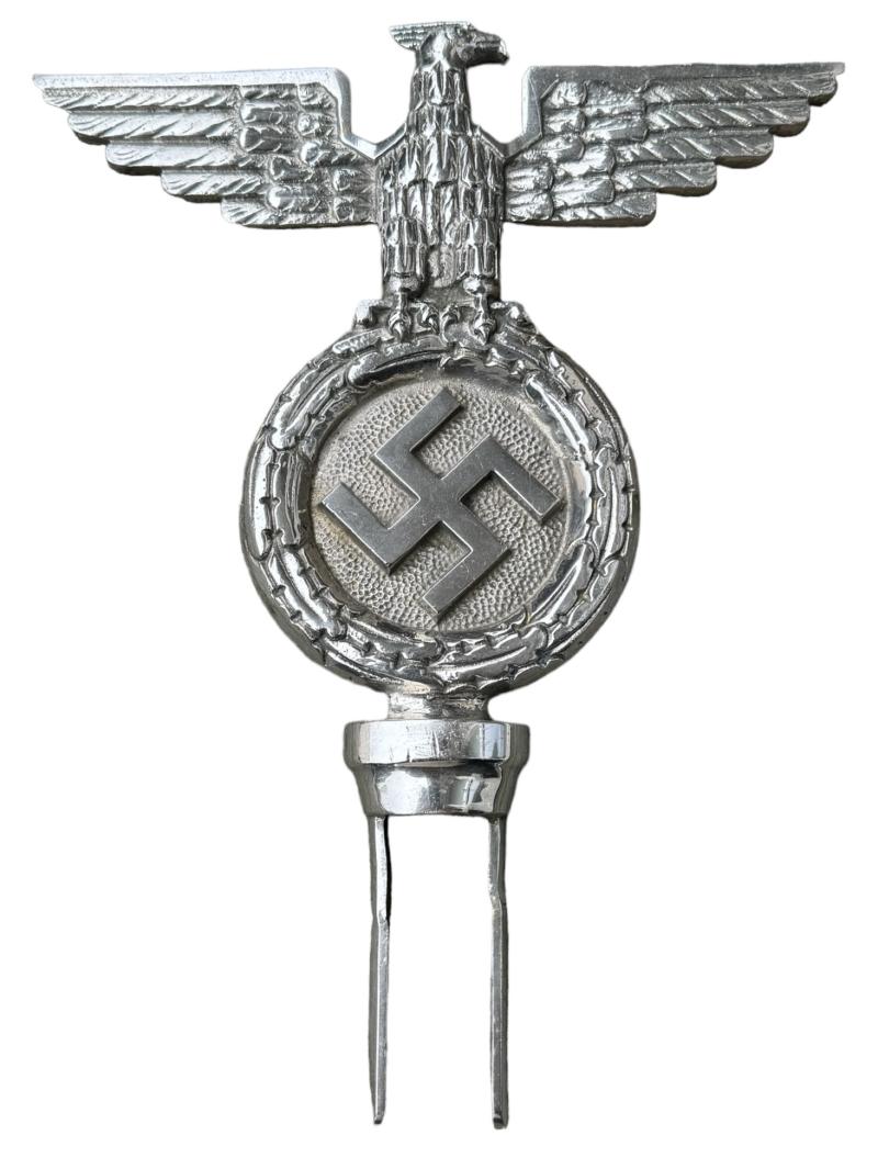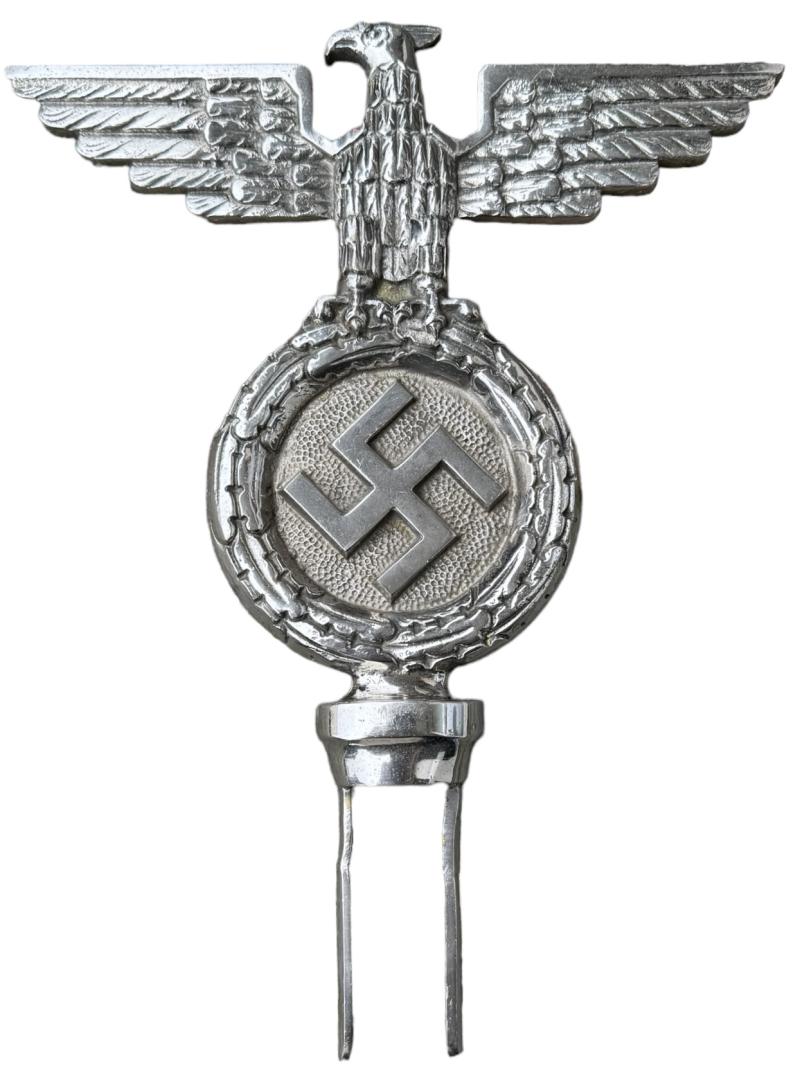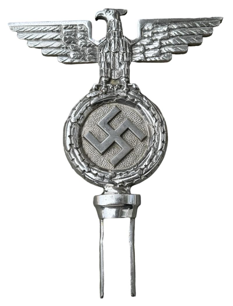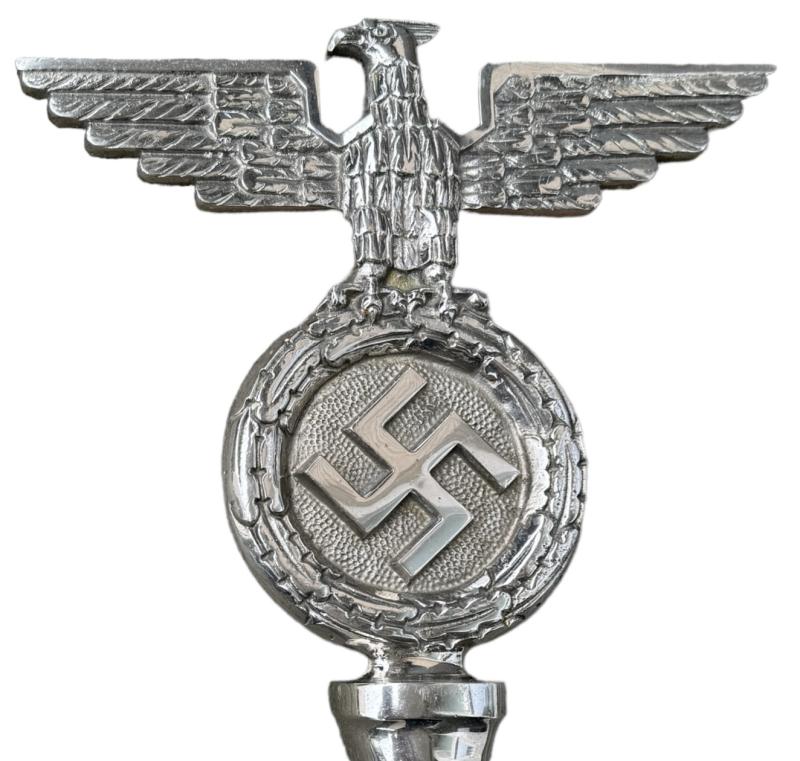 Third Reich NSDAP Pole Top Fantastic heavy early quality Third Reich pole top, “30”cm high and “23”cm wing span. Nickel plated brass NSDAP pole top. In outstanding condition. Great for display!