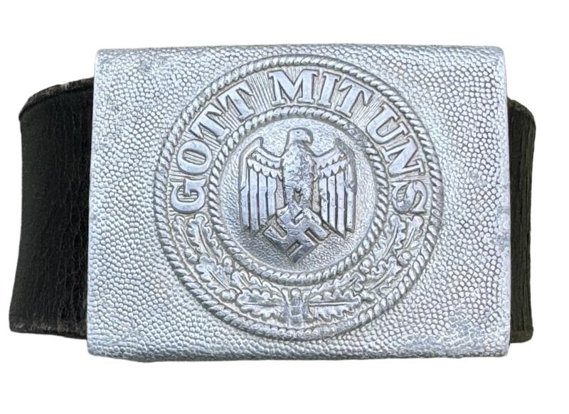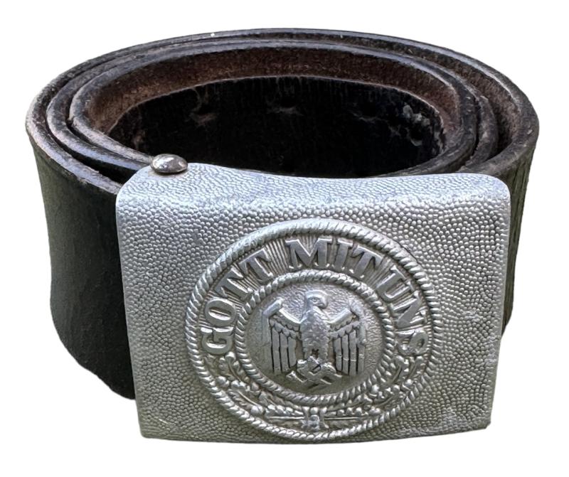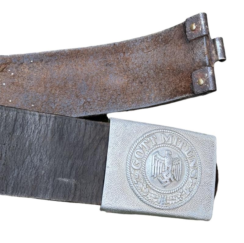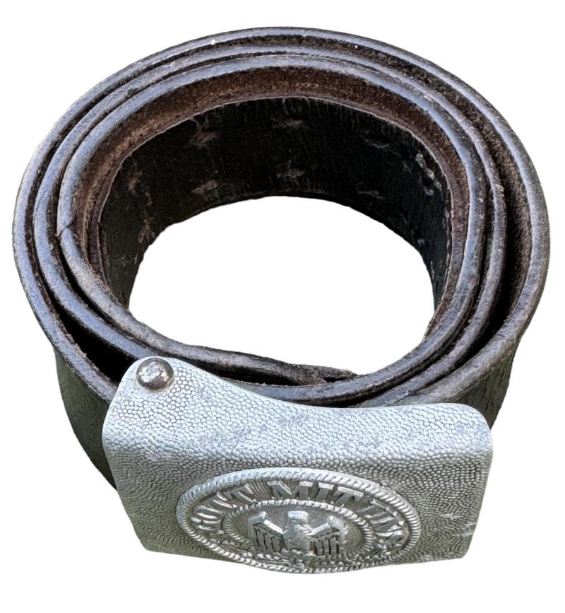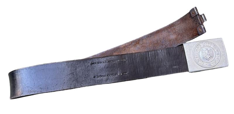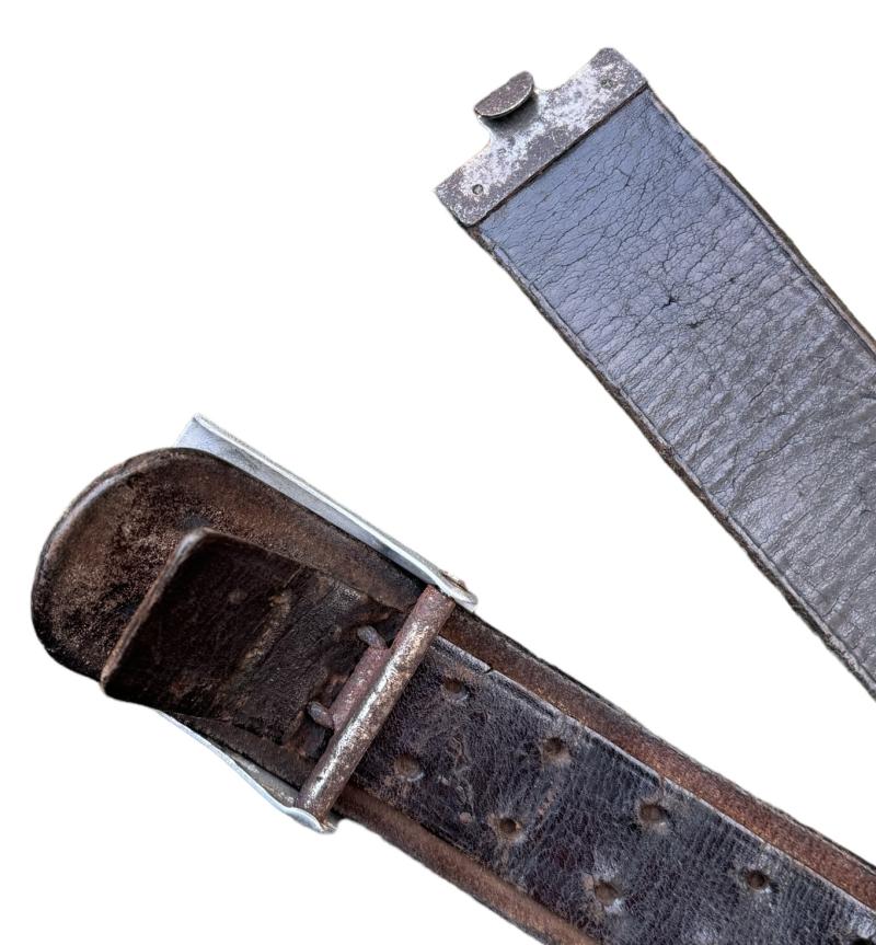 Very nice used Wehrmacht leather dress belt for enlisted man with very nice two piece dress Wehrmacht buckle. To wear on a nice Enlisted or NCO dress tunic “Waffen Rock”