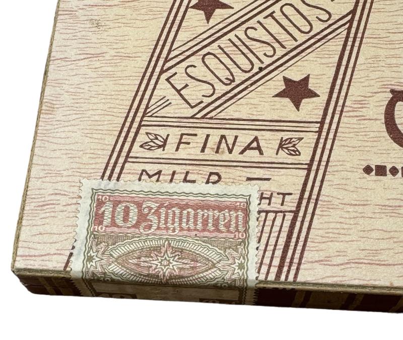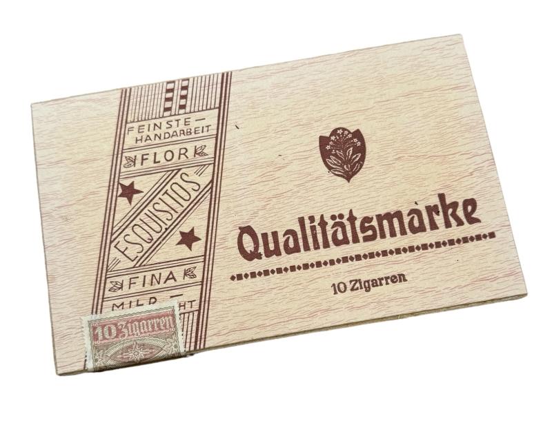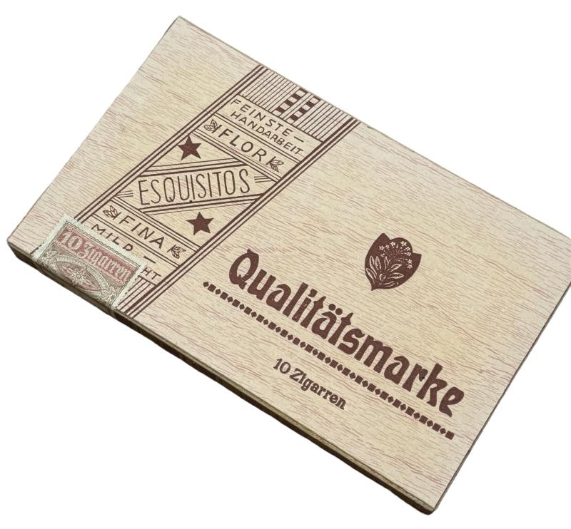 Wehrmacht era Cigars Package Original clipboard Wehrmacht era packaging with content “10” cigars “Esquisitos”. With its original paper closing seal. In very good condition. Great for a personal item display!