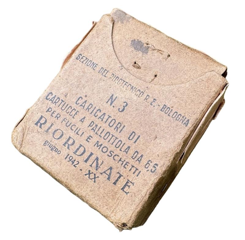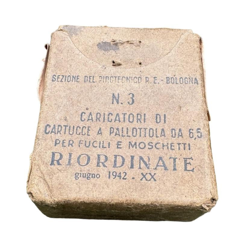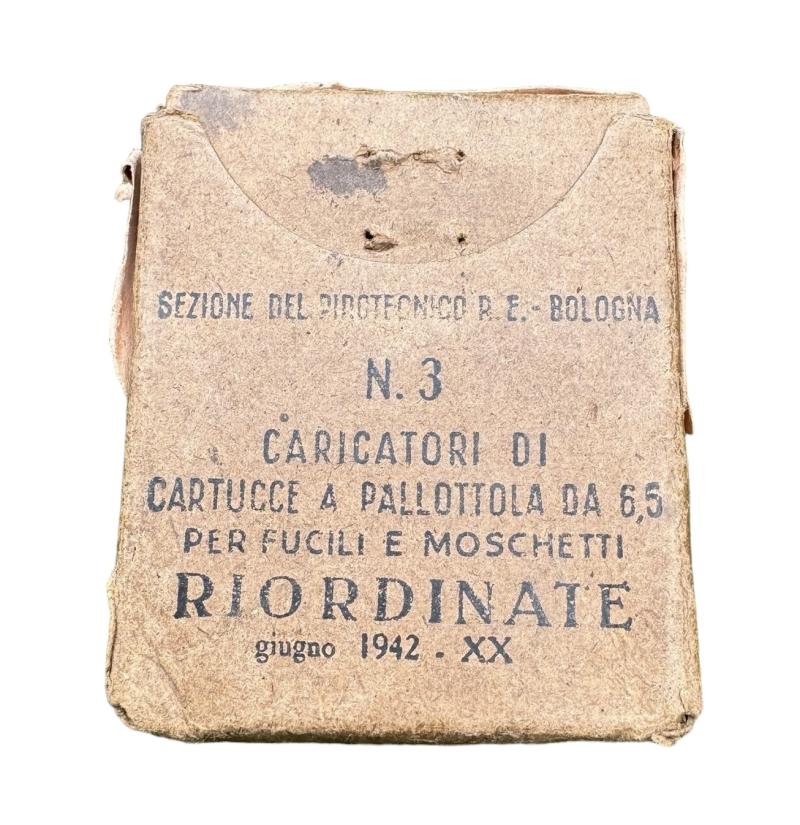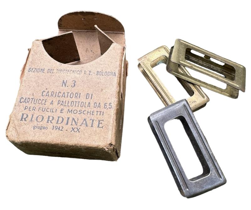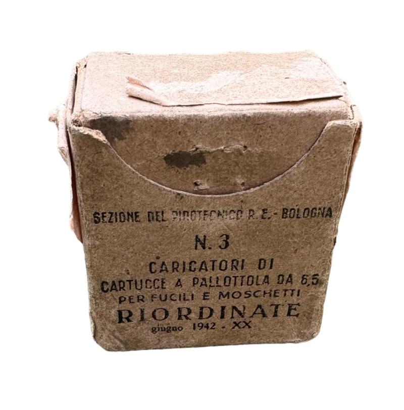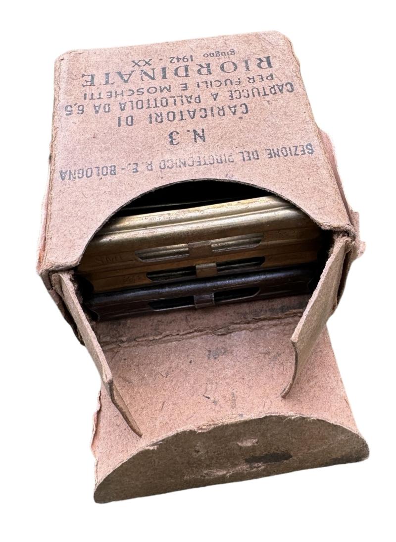 Nice “1942” clipboard Italian ammunition box with 3 metal clips for 5 rounds each. For the Itailan “Carcano” rifle and carbine. In used but very good condition! Nice for display!