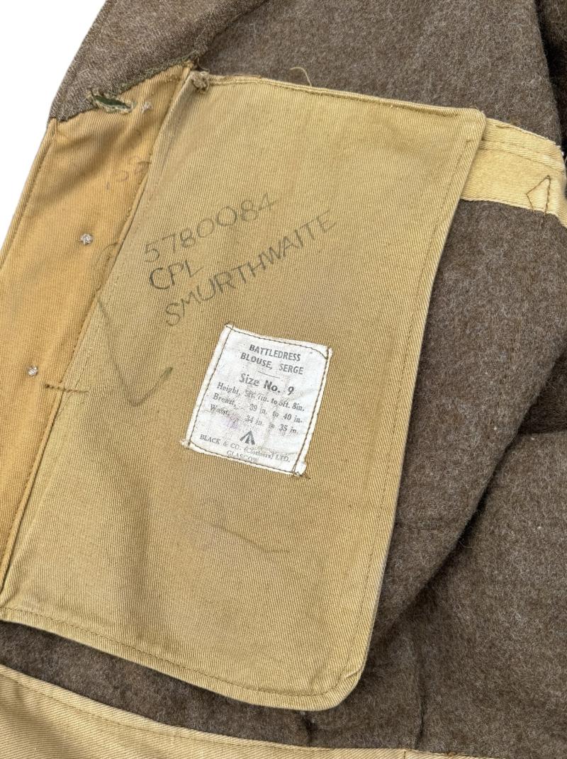 Insignia on the Battle Dress is originally sewed the other insignia is the original insignia and cap badge to complete the Battle Dress. With cloth label “Black & Co. Ltd. Glasgow” in size “9” and named “CPL Smurthwaite” and his personal number attached to the 3th Infantry Division. 3th Brigade.