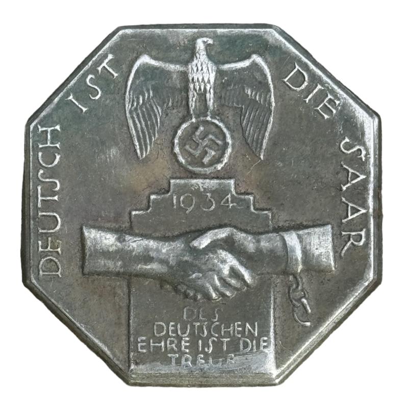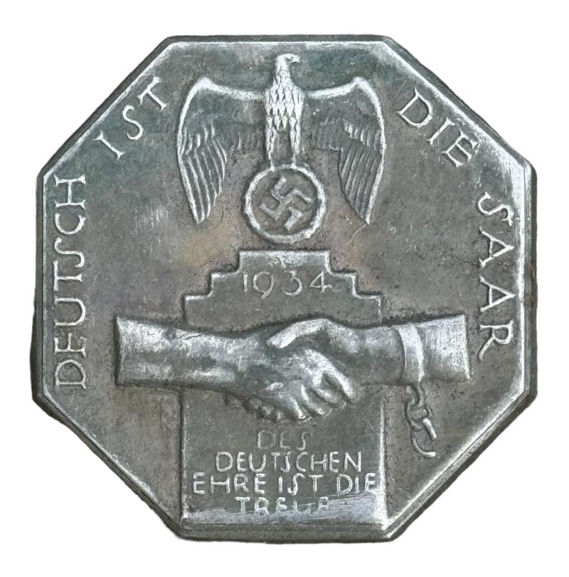 NSDAP/SA badge “Deutsch ist die Saar 1934” “Des Deutsche Ehre ist die Treue” Nice original metal badge in very good condition.