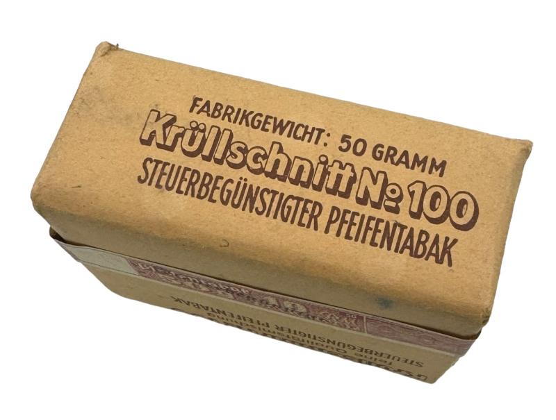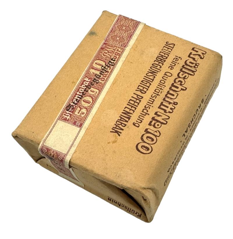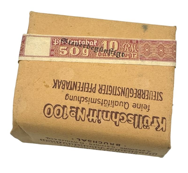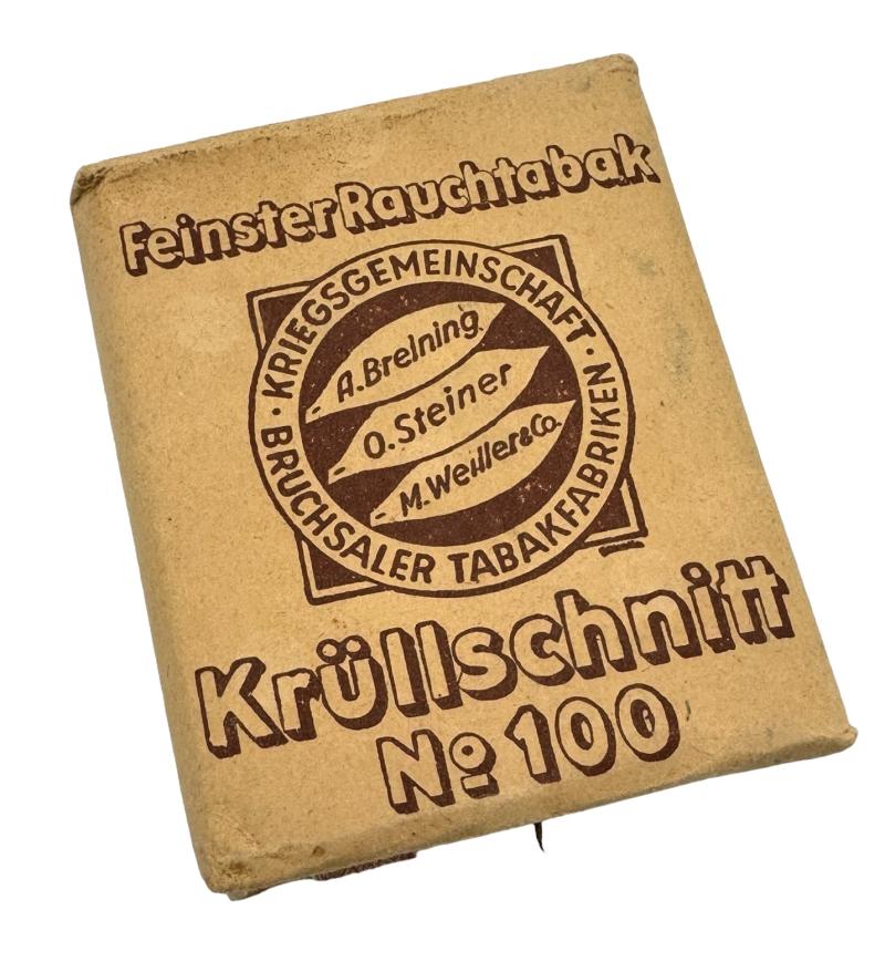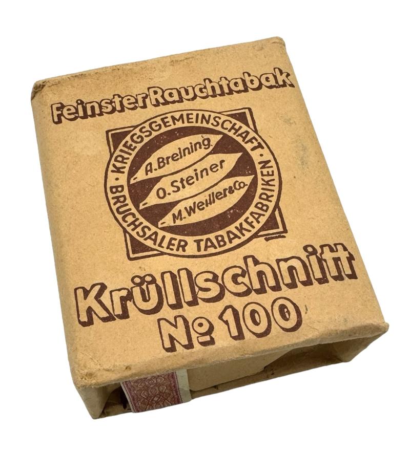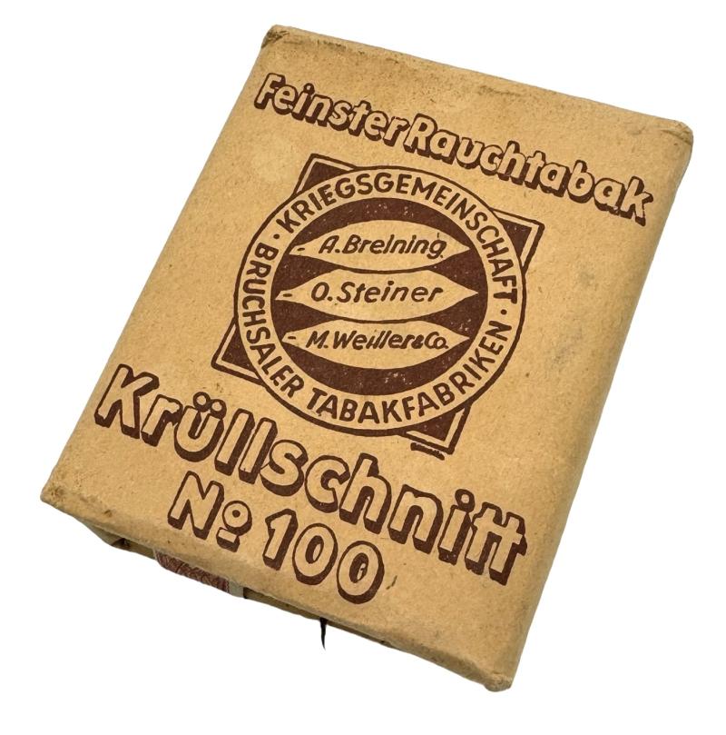 “Krüllsnitt number 100” Tabaco package with content. (Rare to find brand!) nicely marked “Kriegsgemeinschaft Bruchsaker Tabakfabriken”