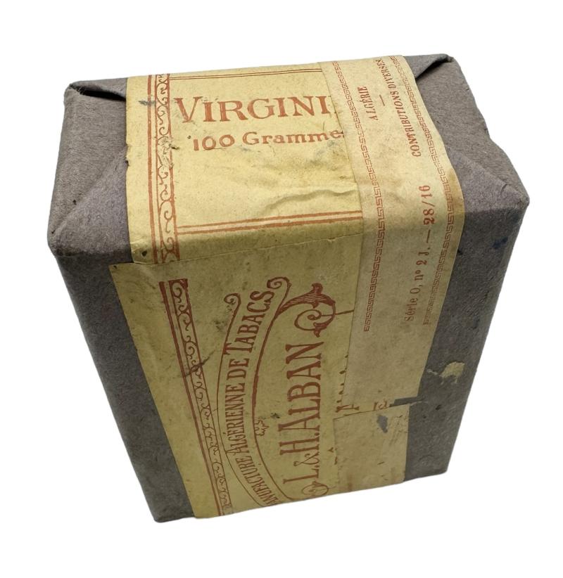 French WW2 era Tabaco “L.&H. Alban” Tabaco package. French WW2 era “100” grams “Virgini” Tabaco. With French tax label. Package with content. Great for display!