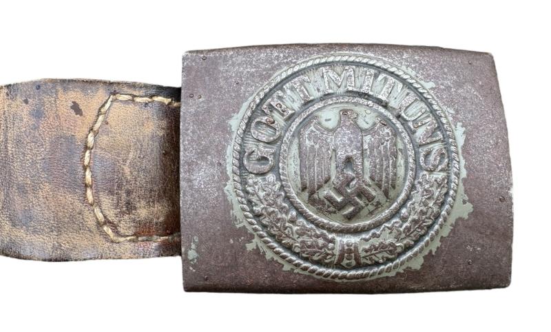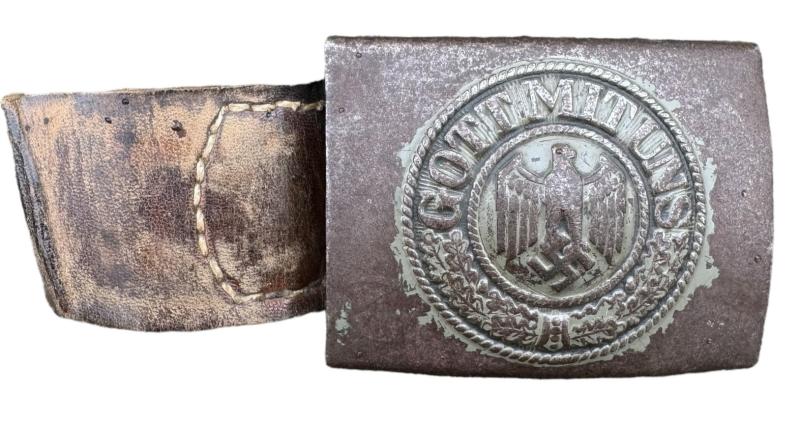 Used but nice steel made Wehrmacht belt buckle with leather tab. Tab marked but hard to read. in 35% of its original field/grey camo paint.