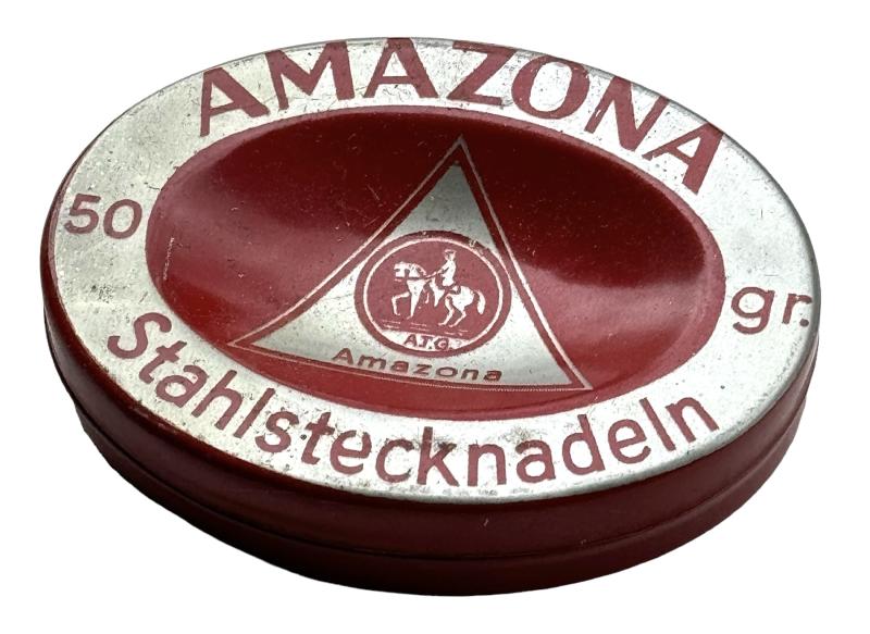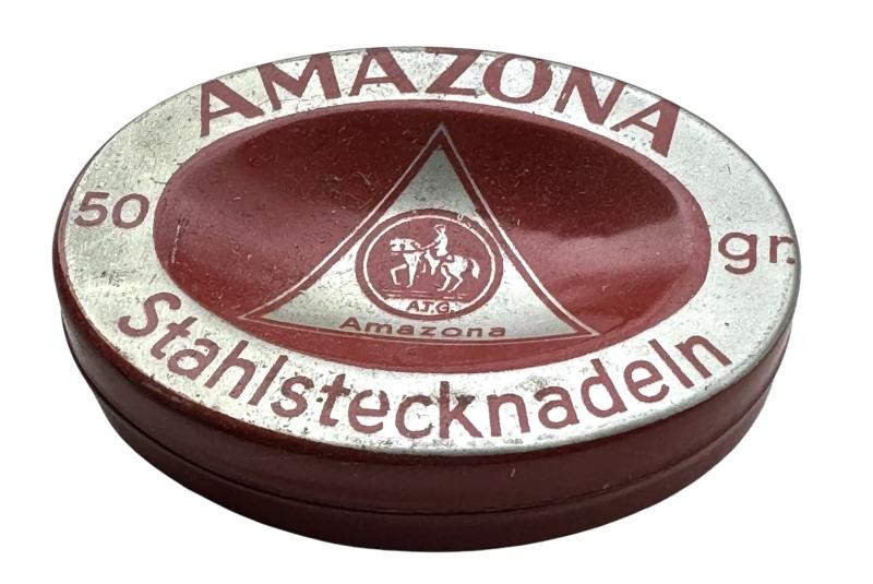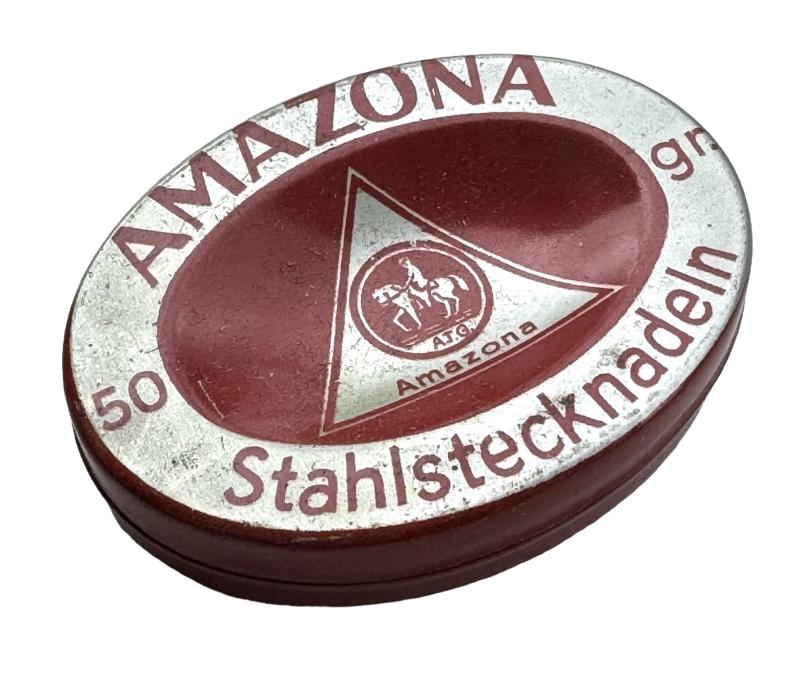 German WW2 era Needle Can Very nice metal can for needles "Amazona, Stahlstecknadeln" Decorative metal can in very good condition.