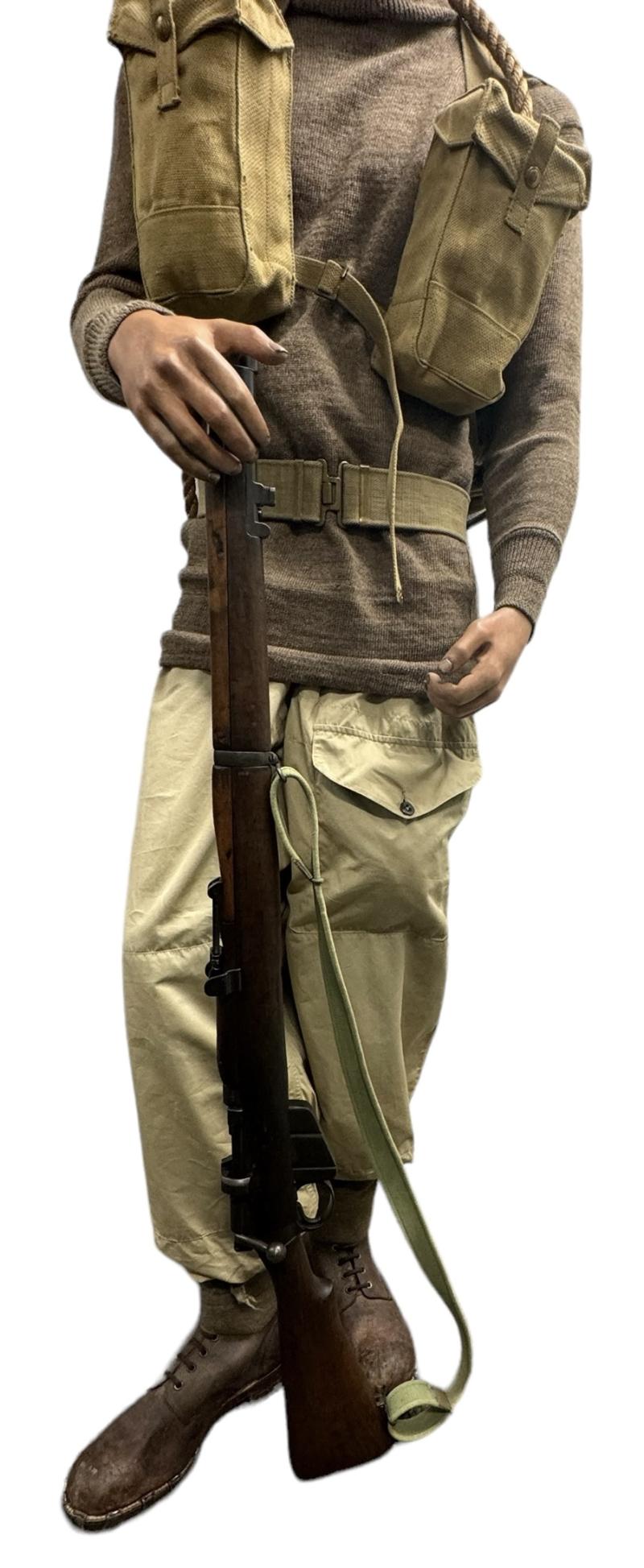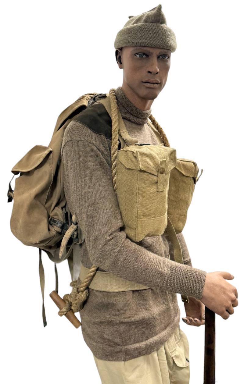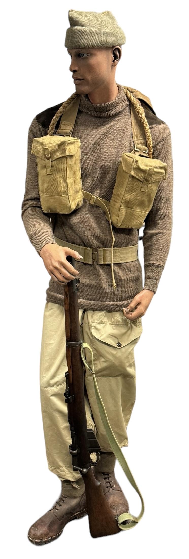 British WW2 mountain low boots, British WW2 “Drap” windproof camo trousers, British WW2 cloth gaters, British WW2 wool “commando” sweater, British WW2 wool “commando” scarce/cap, British WW2 “Bergen” backpack, Canadian WW2 extra basic pouches, British WW2 combat belt, British WW2 “Toggle” rope and a very nice British WW2 SMLE 303 rifle with carrying strap.
