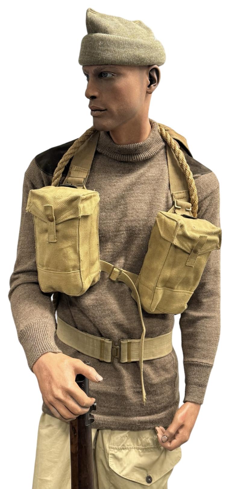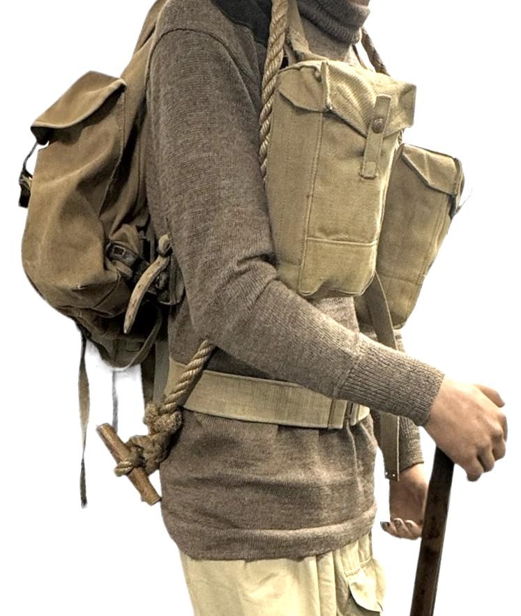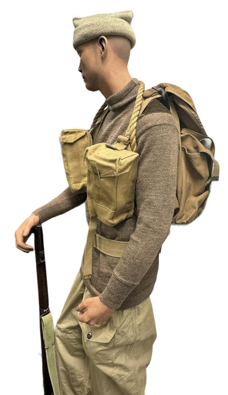 British WW2 mountain low boots, British WW2 “Drap” windproof camo trousers, British WW2 cloth gaters, British WW2 wool “commando” sweater, British WW2 wool “commando” scarce/cap, British WW2 “Bergen” backpack, Canadian WW2 extra basic pouches, British WW2 combat belt, British WW2 “Toggle” rope and a very nice British WW2 SMLE 303 rifle with carrying strap.