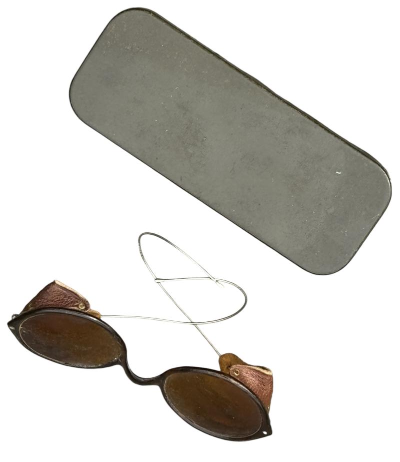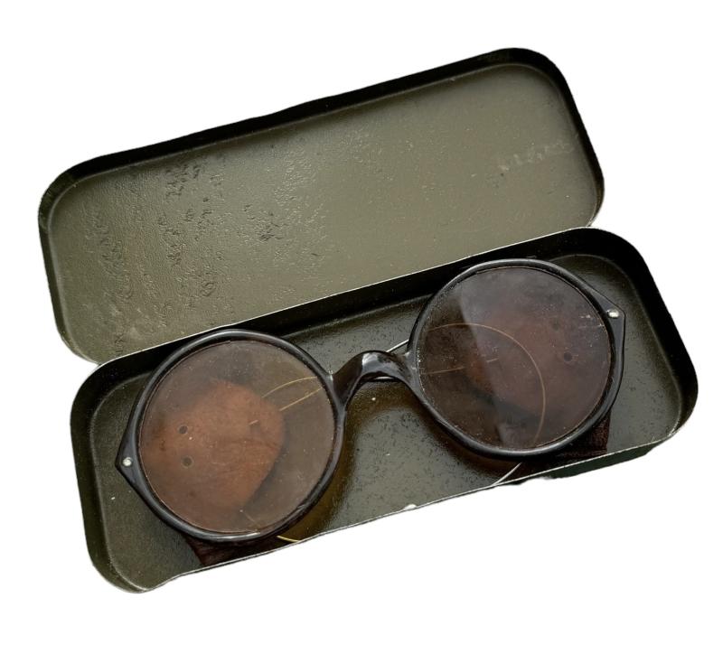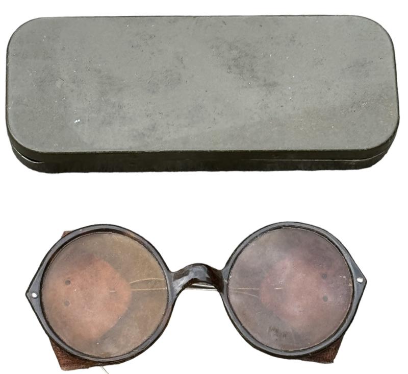 Very nice bakelite made Wehrmacht MG (Machinegun) gunner sunglasses in original metal case. With leather sun blinders on both sides.