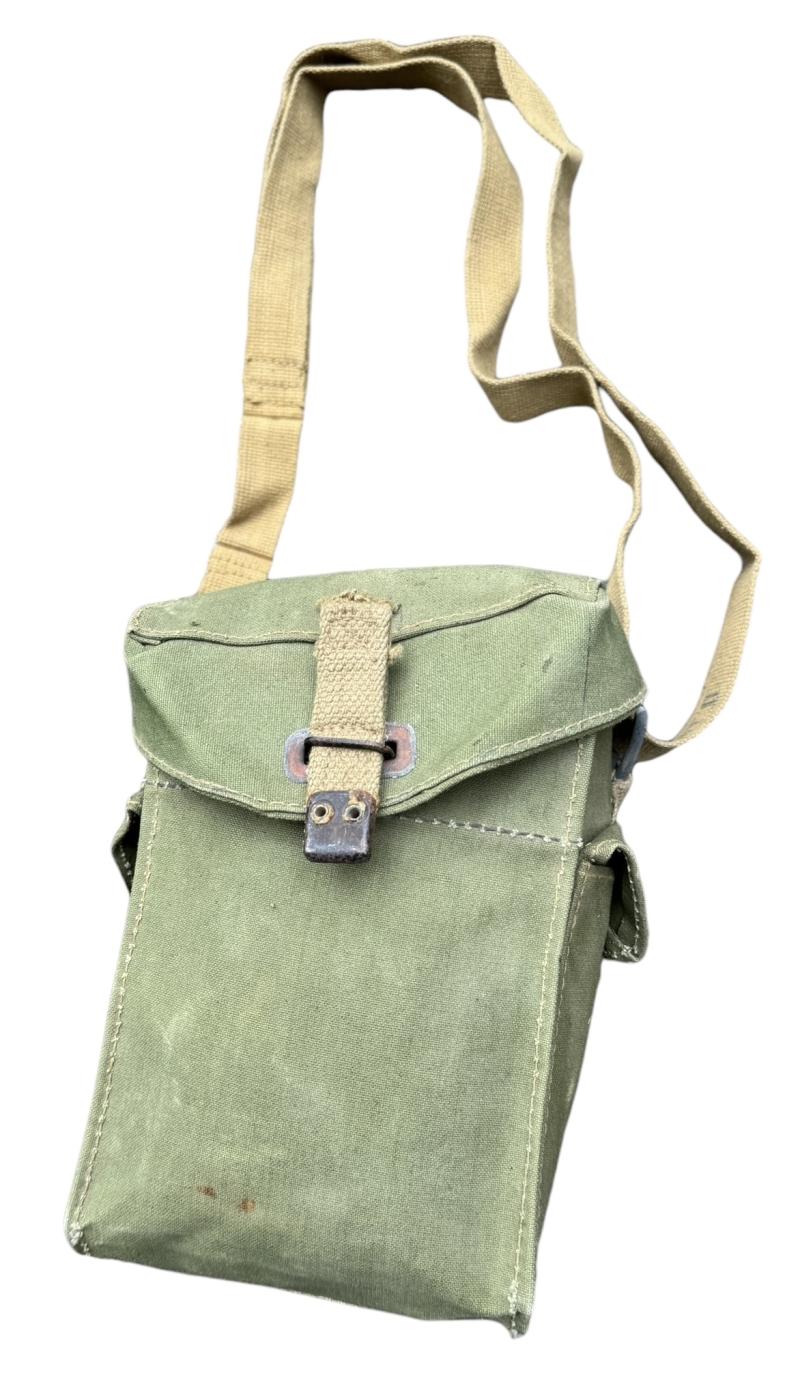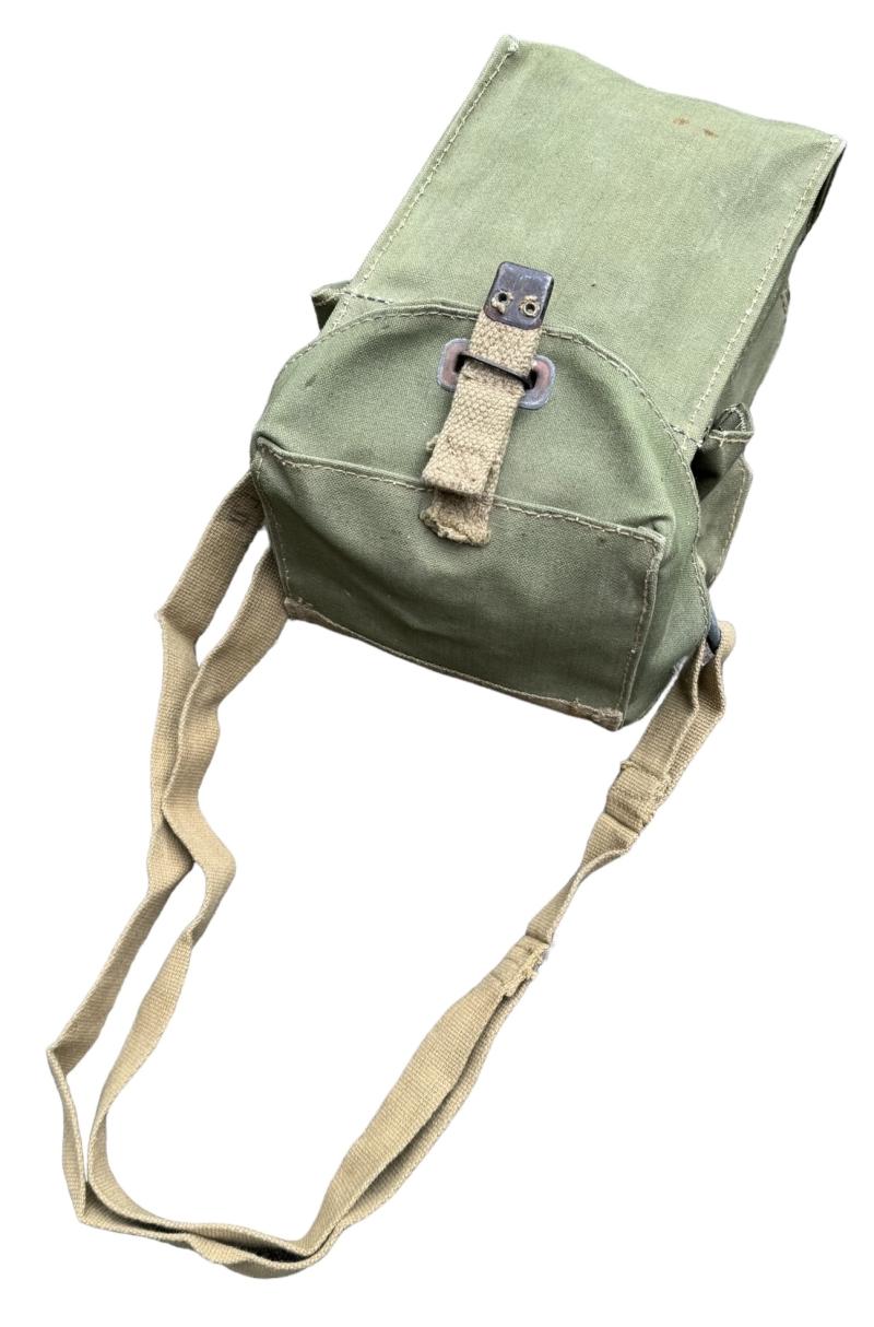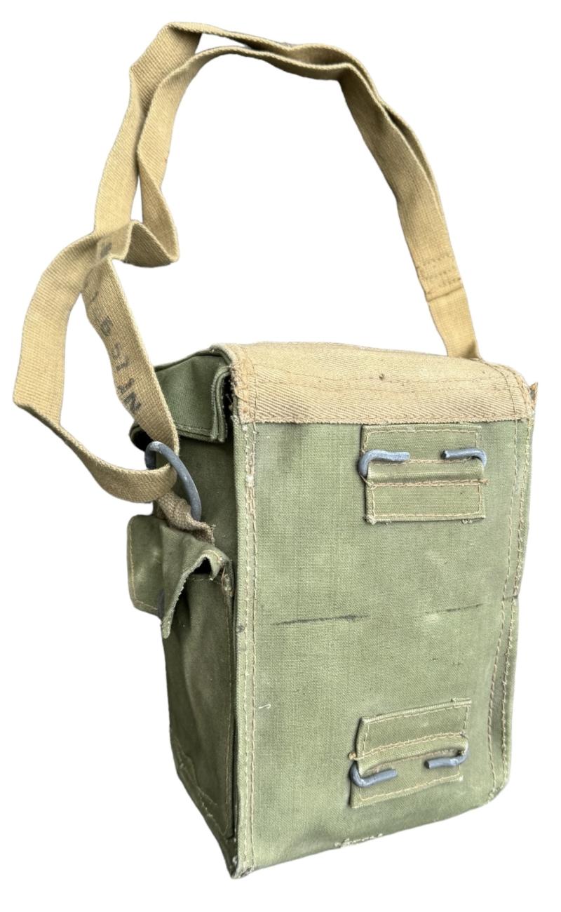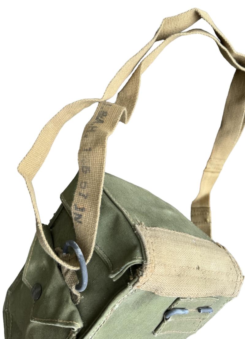 British WW2 second model Gasmask Bag. Nice used second model British light weight assault gasmask bag. Overal a nice used British gasmask bag with strap in very good condition.