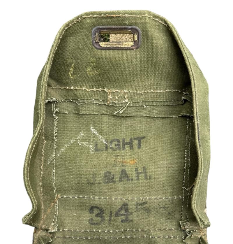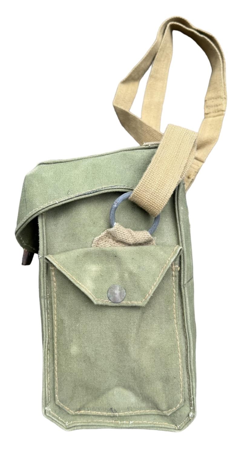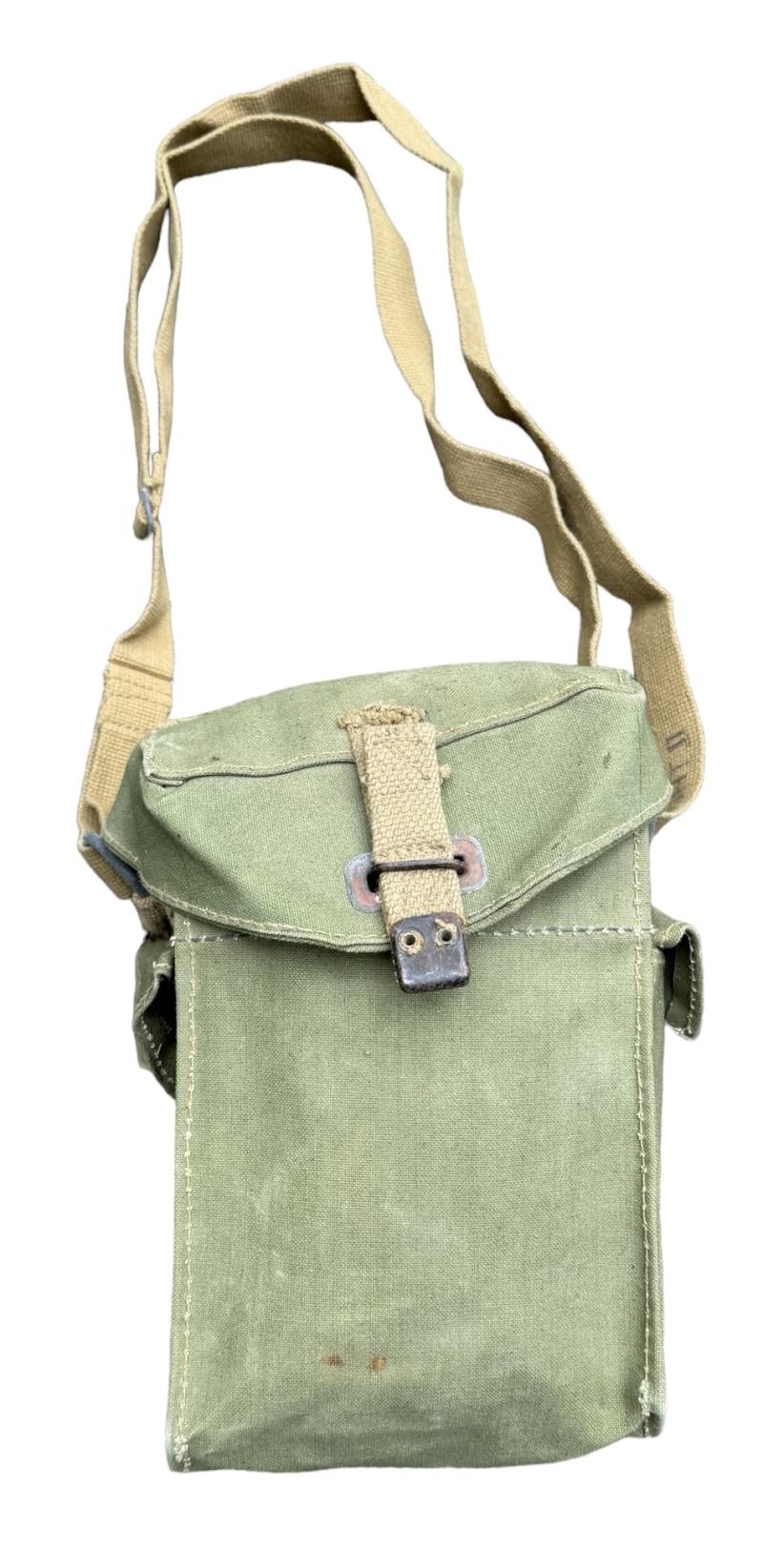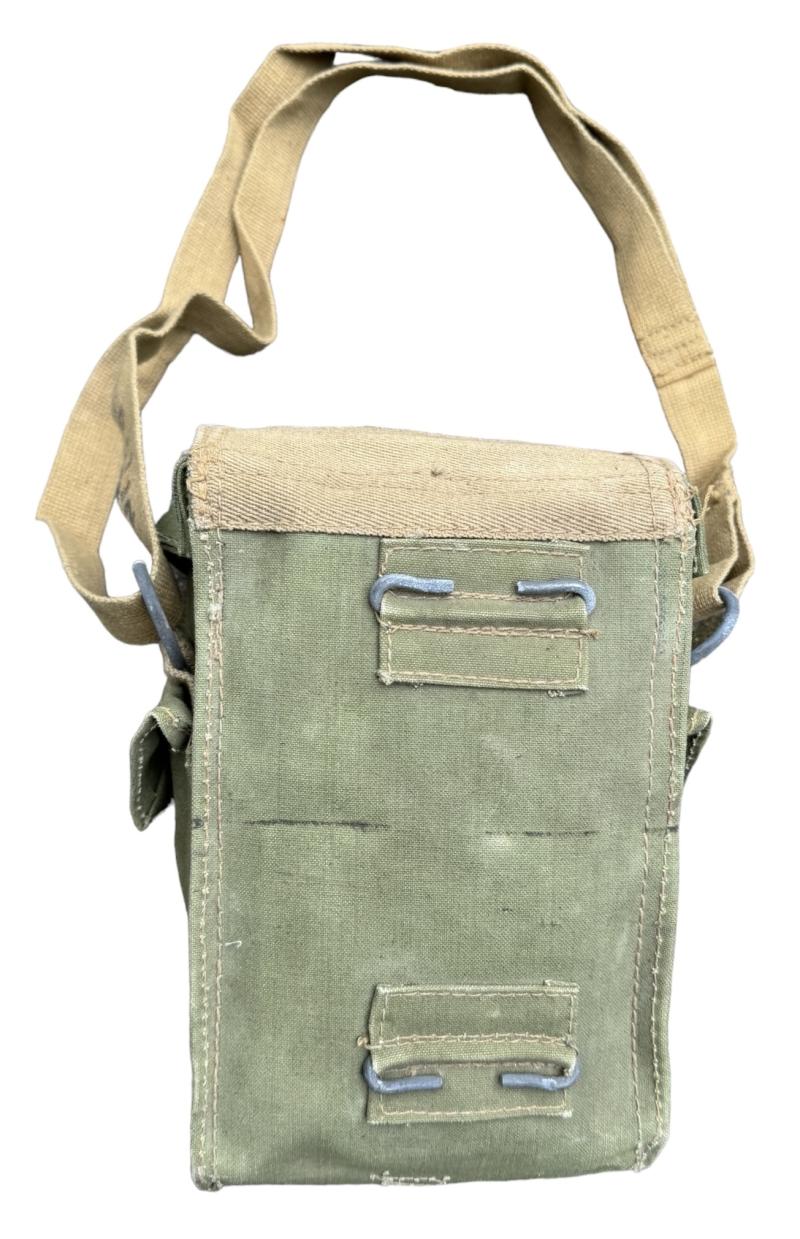 British WW2 second model Gasmask Bag. Nice used second model British light weight assault gasmask bag. Overal a nice used British gasmask bag with strap in very good condition.