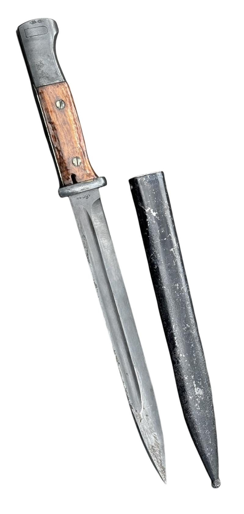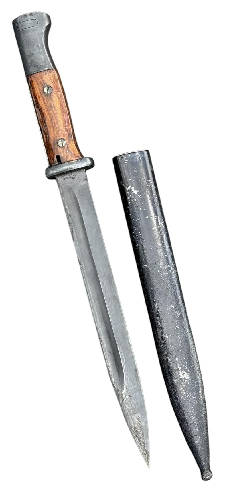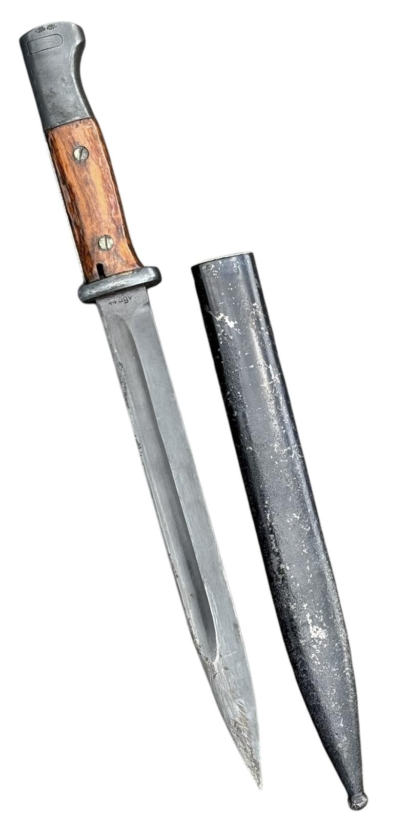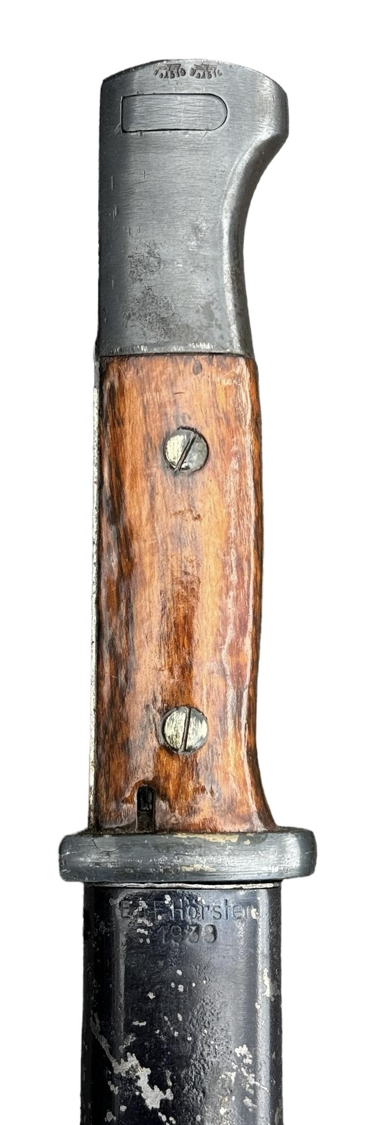 Wehrmacht K98 Bayonet Very nice, non matching Wehrmacht K98 bayonet in steel scabbard. Bayonet maker marked “AGV” dated “”1944” and the scabbard “F. Hörster” dated “1938” Overal a nice K98 Bayonet in good condition.