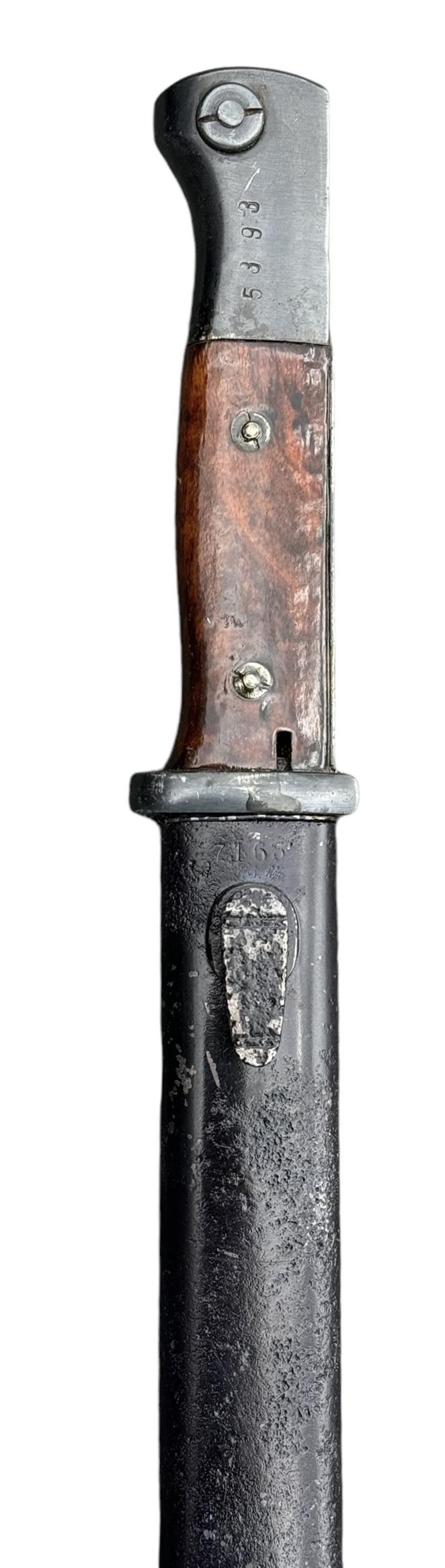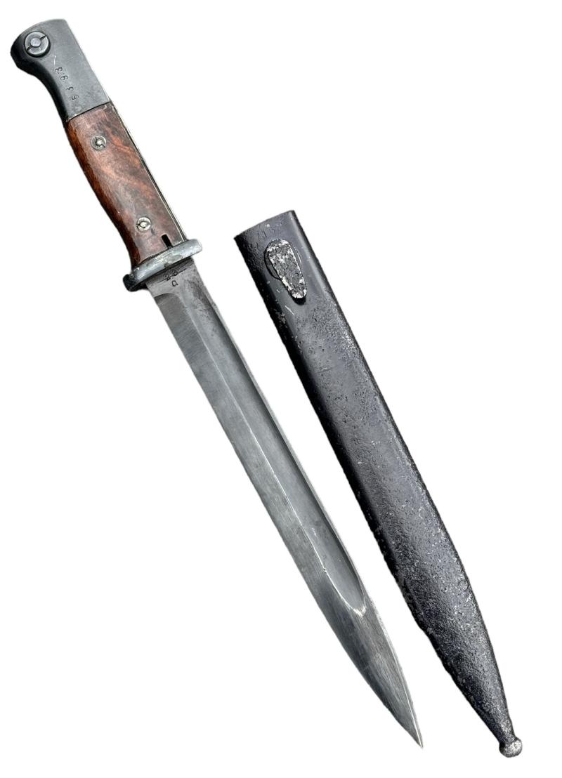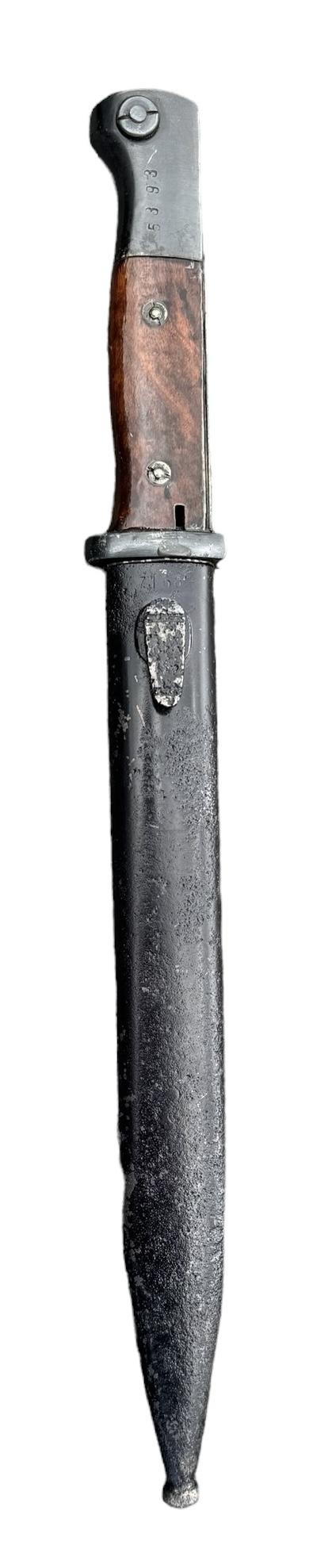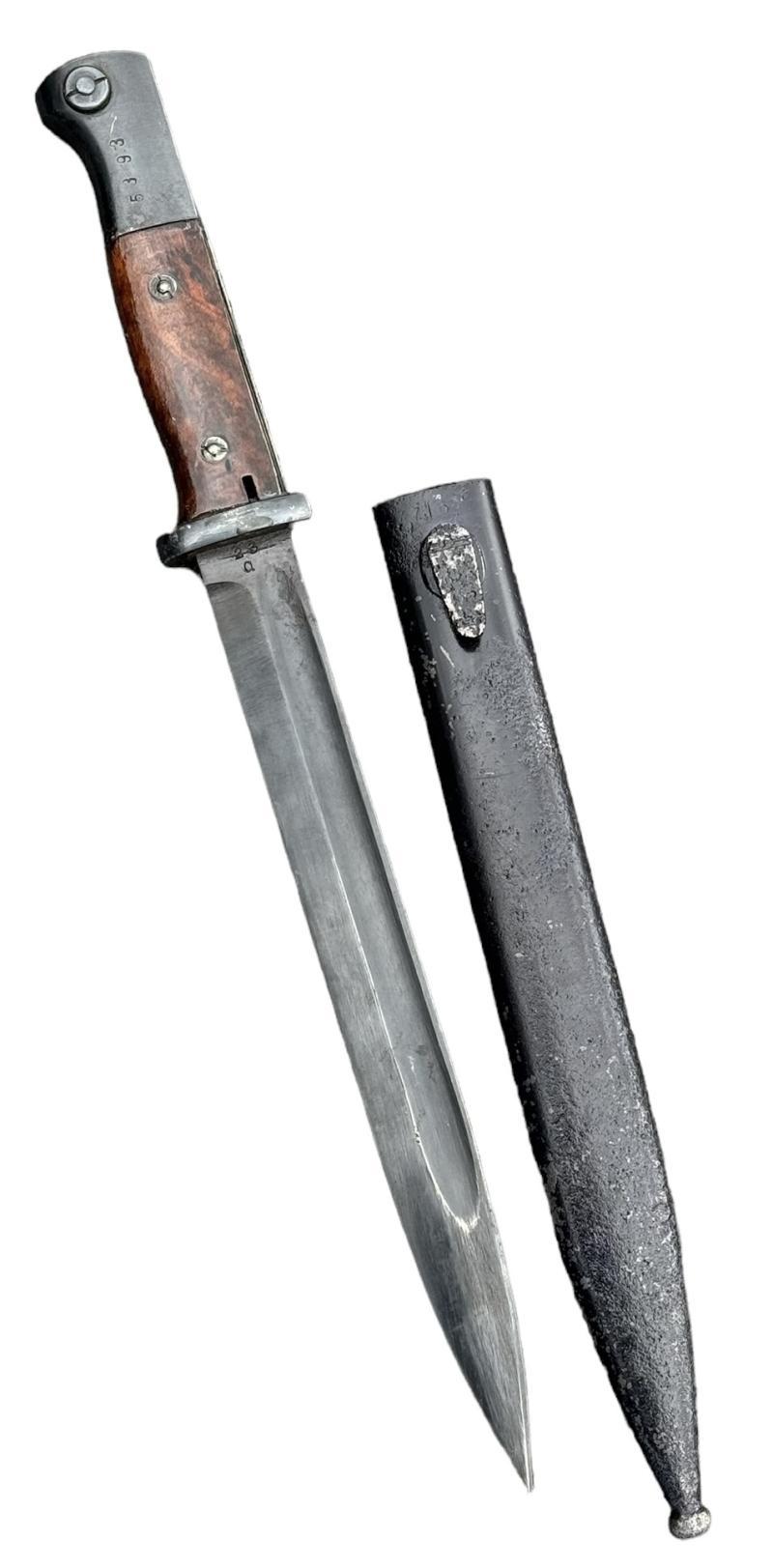 Wehrmacht K98 Bayonet Very nice, non matching Wehrmacht K98 bayonet in steel scabbard. Bayonet maker marked “AGV” dated “”1944” and the scabbard “F. Hörster” dated “1938” Overal a nice K98 Bayonet in good condition.