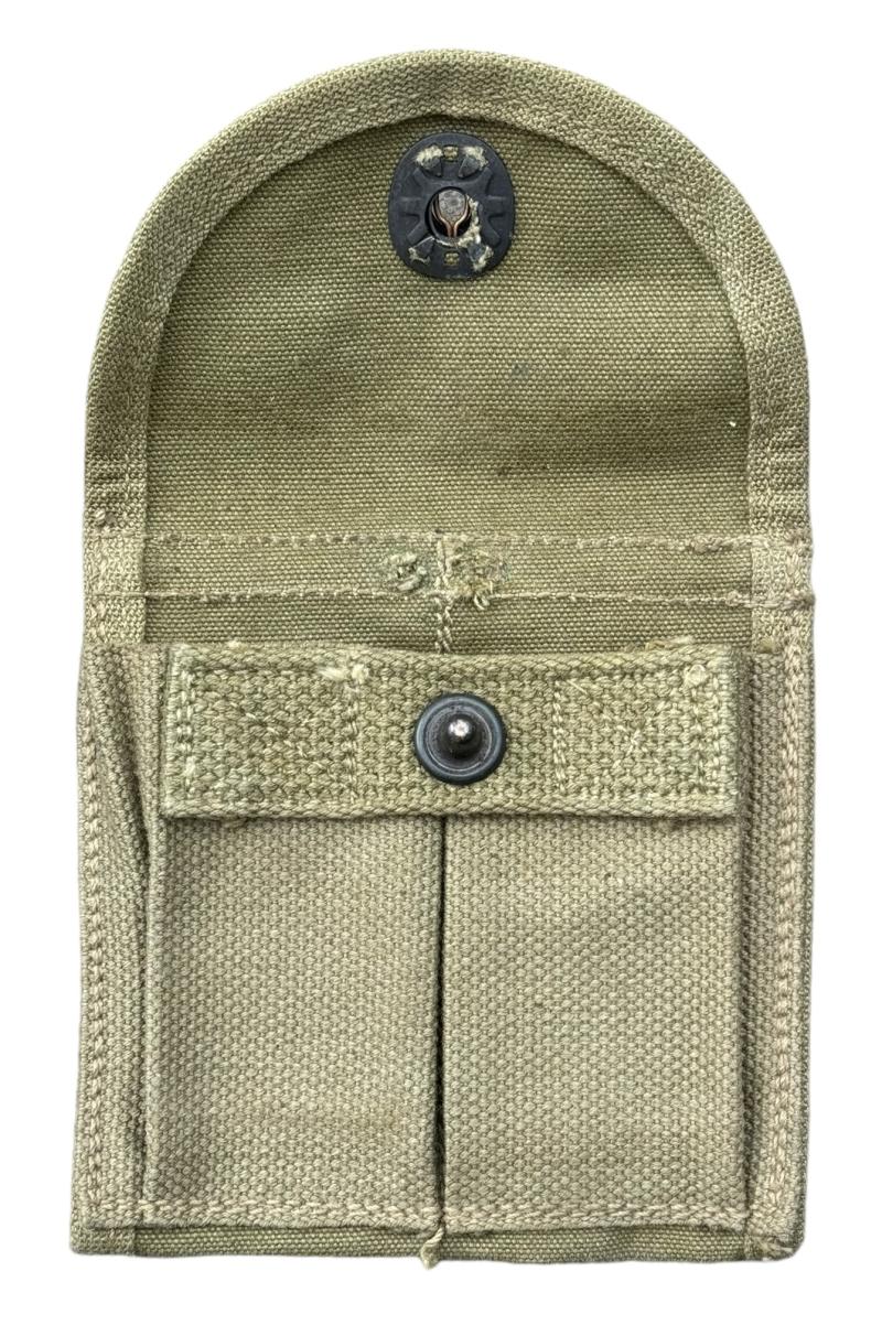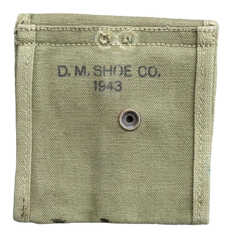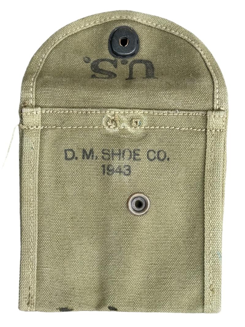 Mint condition US WW2 M1 Carbine magazine pouch Maker marked “D.M. Shoe Co.” and dated “1943” Pouch was made to holt 2 box magazines with each 15 rounds in Caliber .30 M1 Carbine ammunition. Impossible to upgrade!