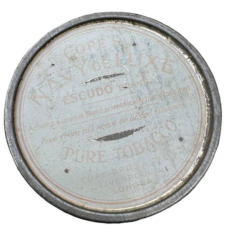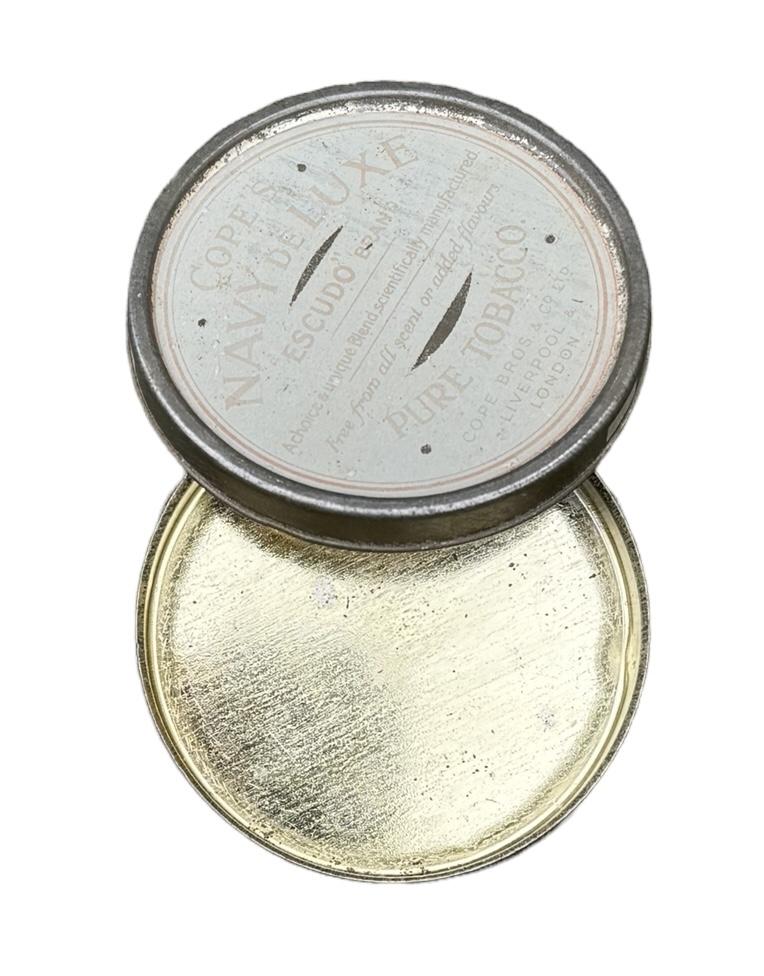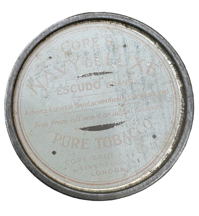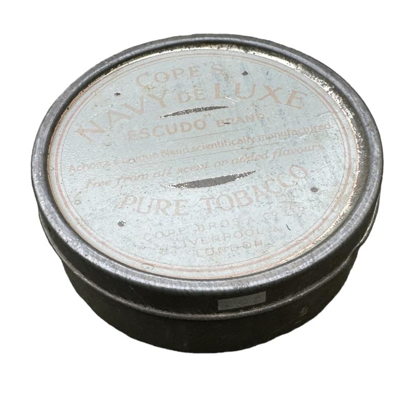 British WW2 Tabaco Can (Cope’s Navy de Luxe) Nice decorative British WW2 tabaco can. “Cope’s Navy de Luxe” (no content) In used but good condition. Great for display!
