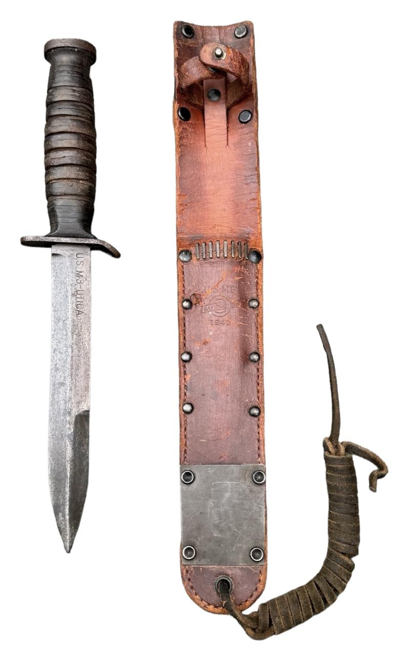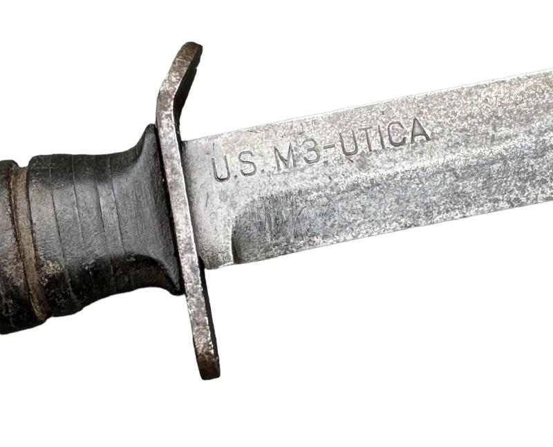 Used but nice untouched US WW2 2nd model M3 combat knife made by “Utica” in very nice used and untouched US WW2 M6 modified scabbard.