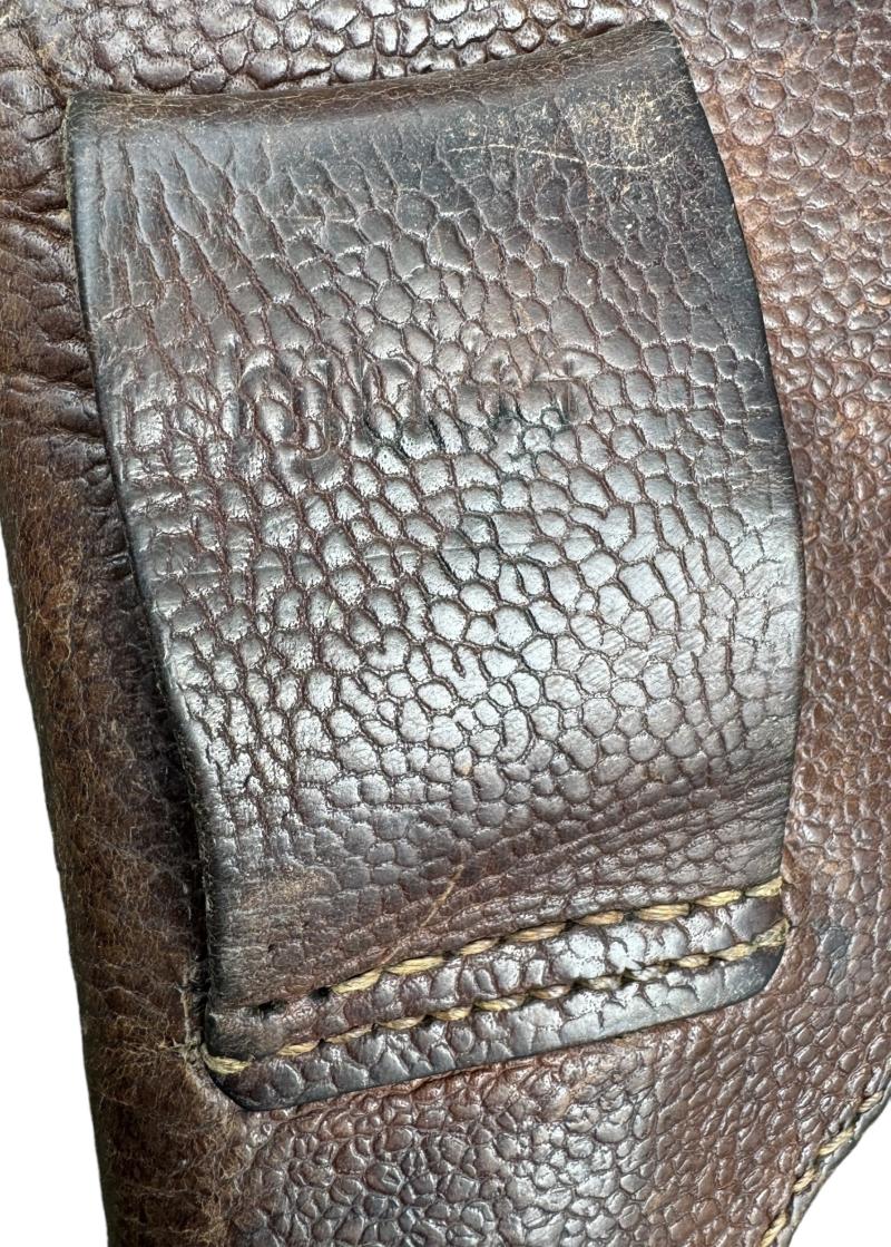 Holster is maker marked (hard to read because of the pebbled leather) and dated “1944”