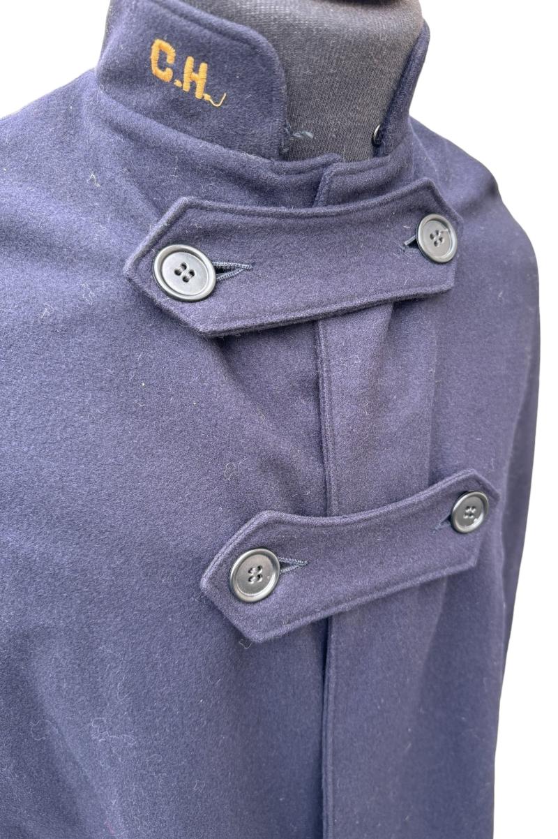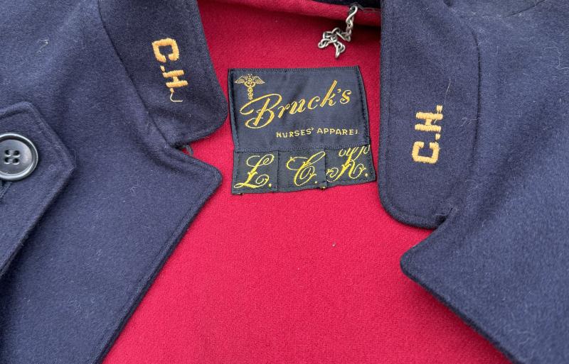 “Bruck’s Nurces Apparel” with nice woven on cloth initials of the nurse. With nice red wool lining and woven “C.H.” in the collar. In the lining are minor moth nips but overal the cape is in outstanding condition.