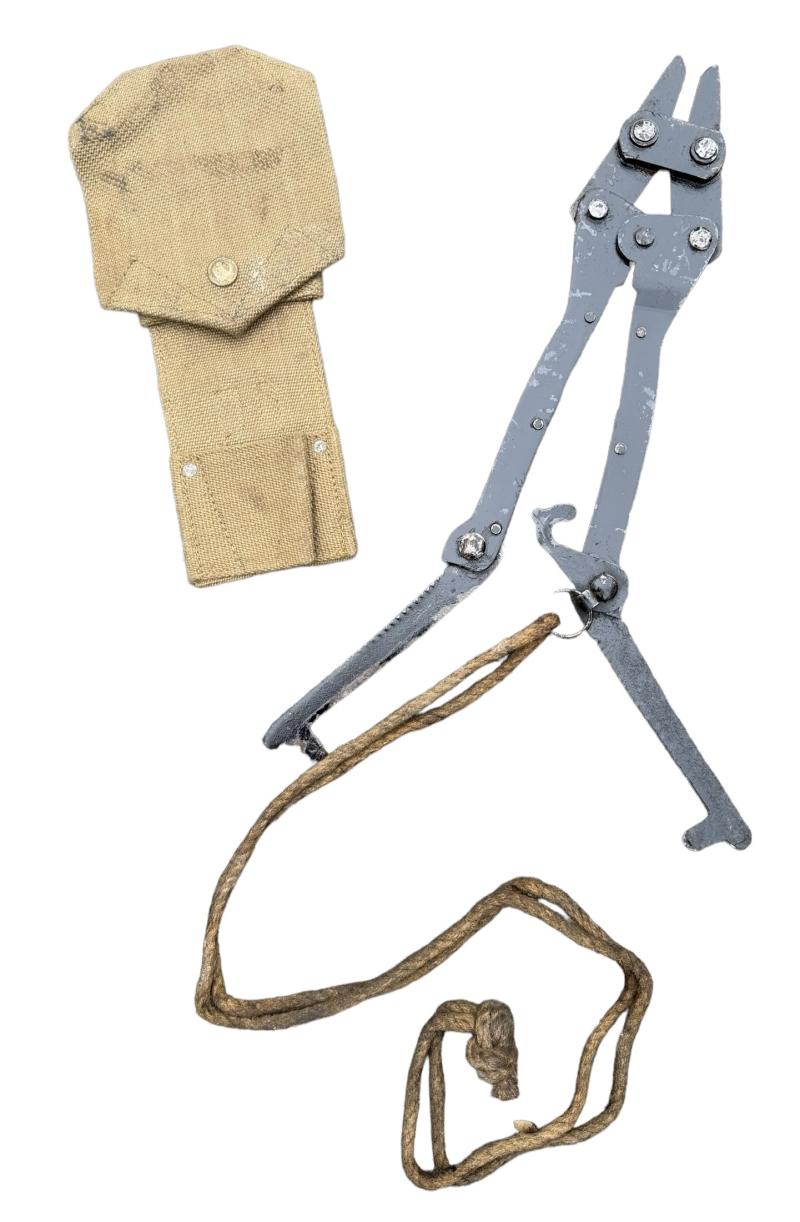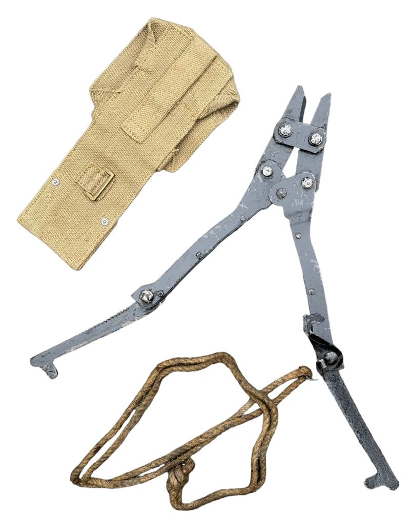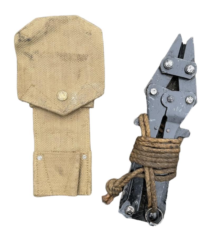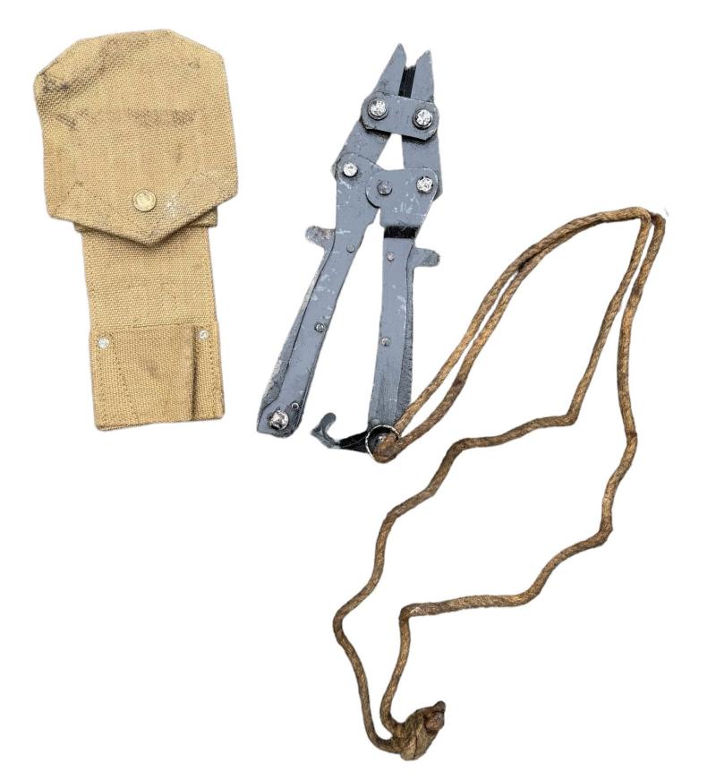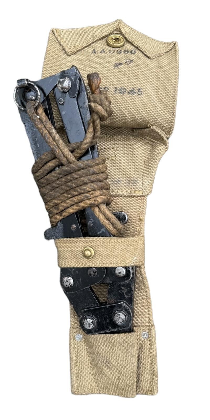 British WW2 Wire Cutter in pouch Nice used British WW2 wire cutter in pouch. Wire cutter comes with its original rope. Pouch maker marked and dated “1945” Both in very good condition.
