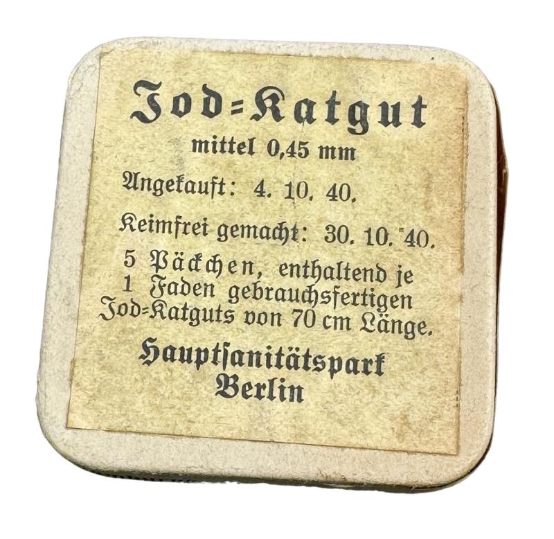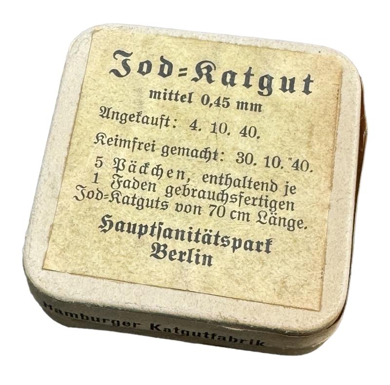 Wehrmacht Medical Sature Jod-Katgut 5 packages in this original carton case of Wehrmacht sature. Jod Katgut Dated "1940” In very good condition.