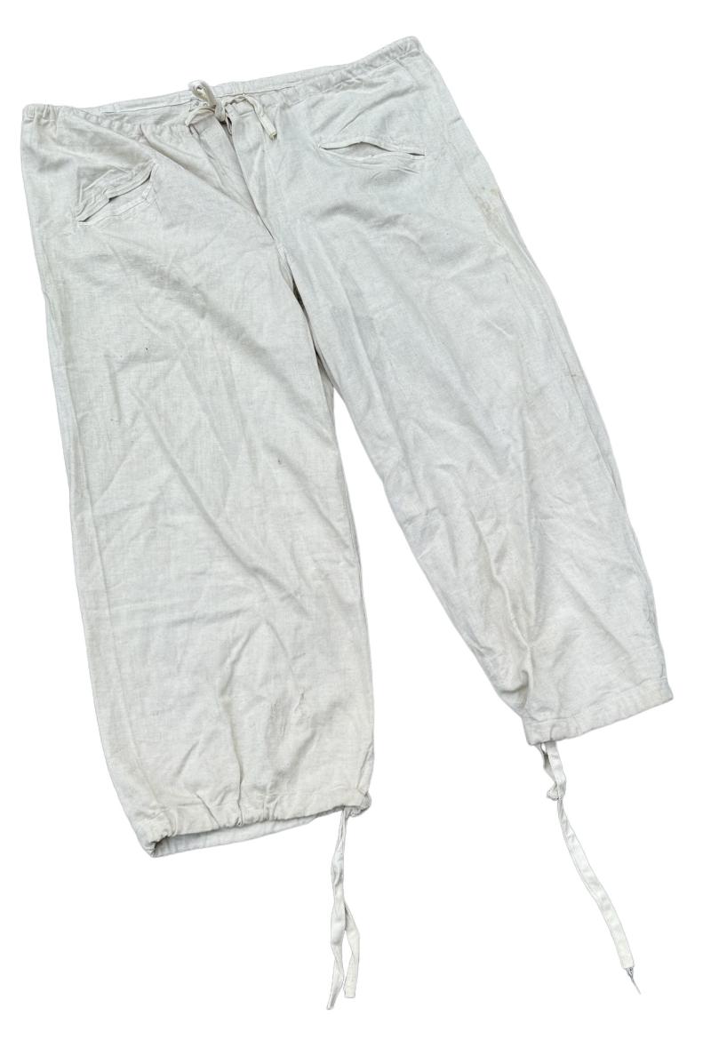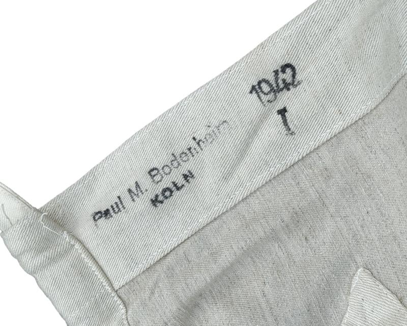 Official Wehrmacht model winter (snow) camo trousers to wear on top of the second model (non reversible) winter camouflage trousers (Splitter or Water-Tan camo). Nicely maker marked “Paul M. Bodenheim, Köln” in size “1” and dated “1942”