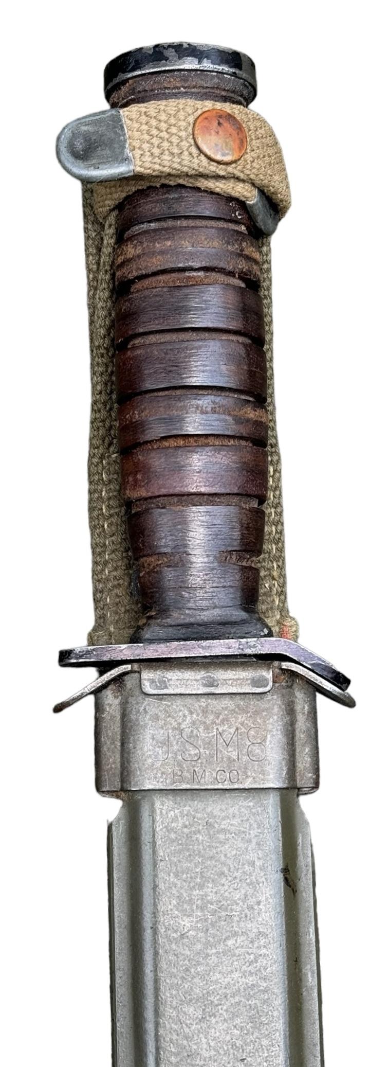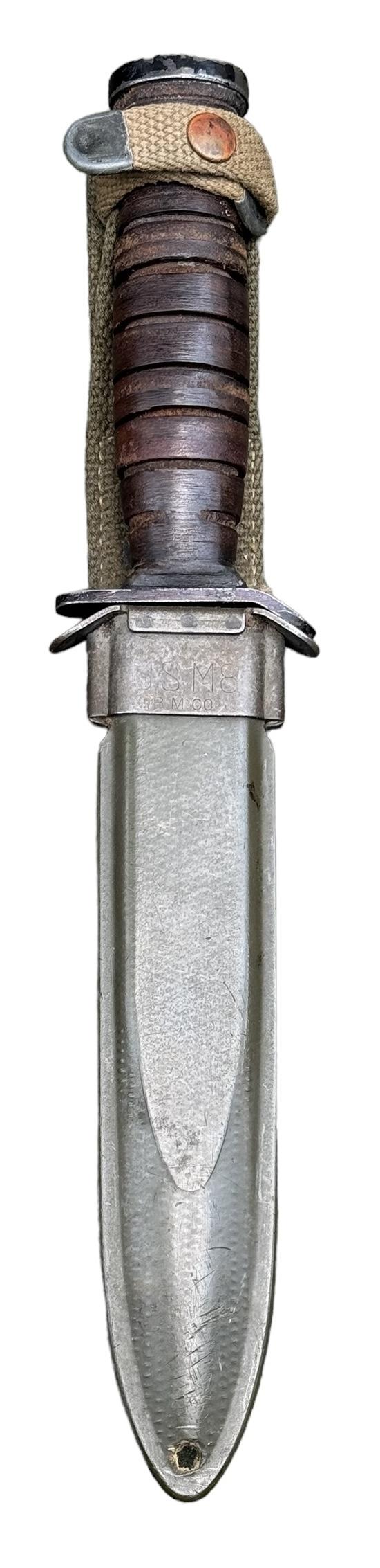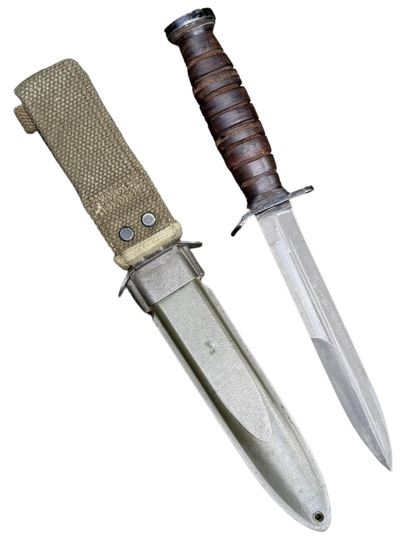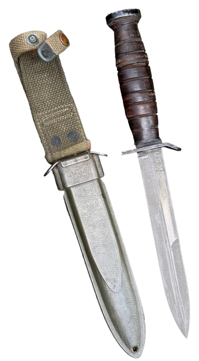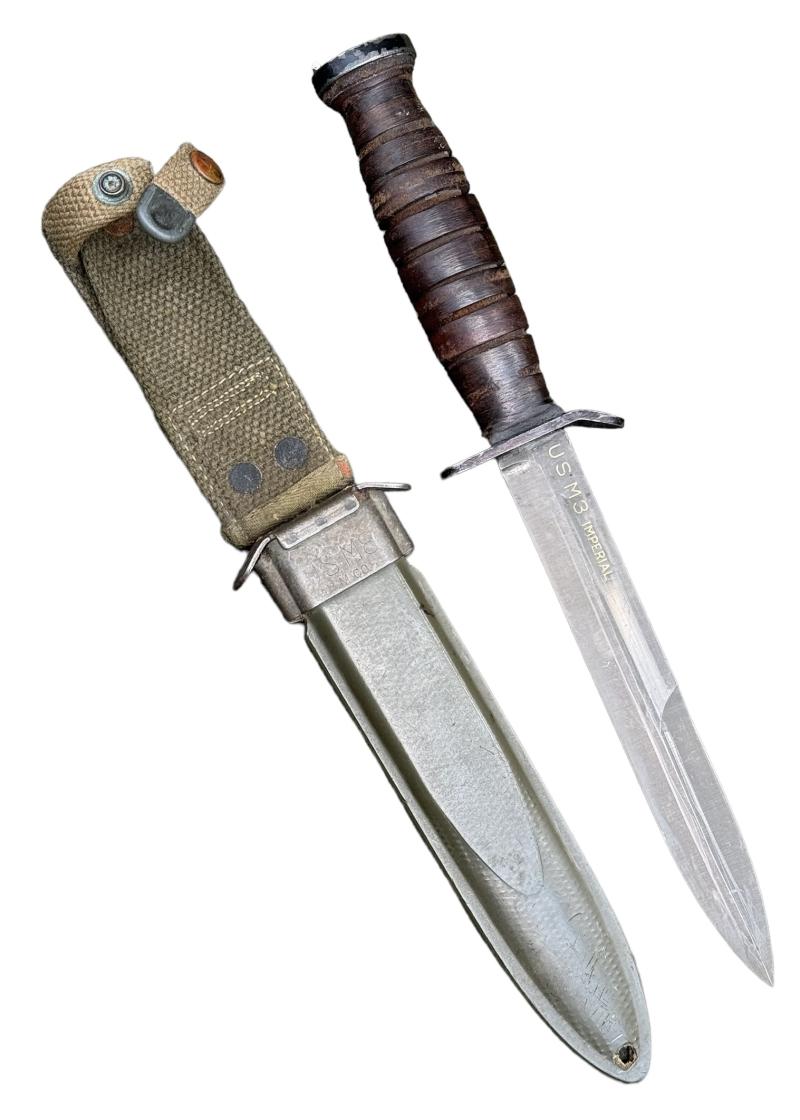 Nice used and untouched US WW2 2nd Model M3 combat knife made by “Imperial” in US WW2 M8 scabbard.