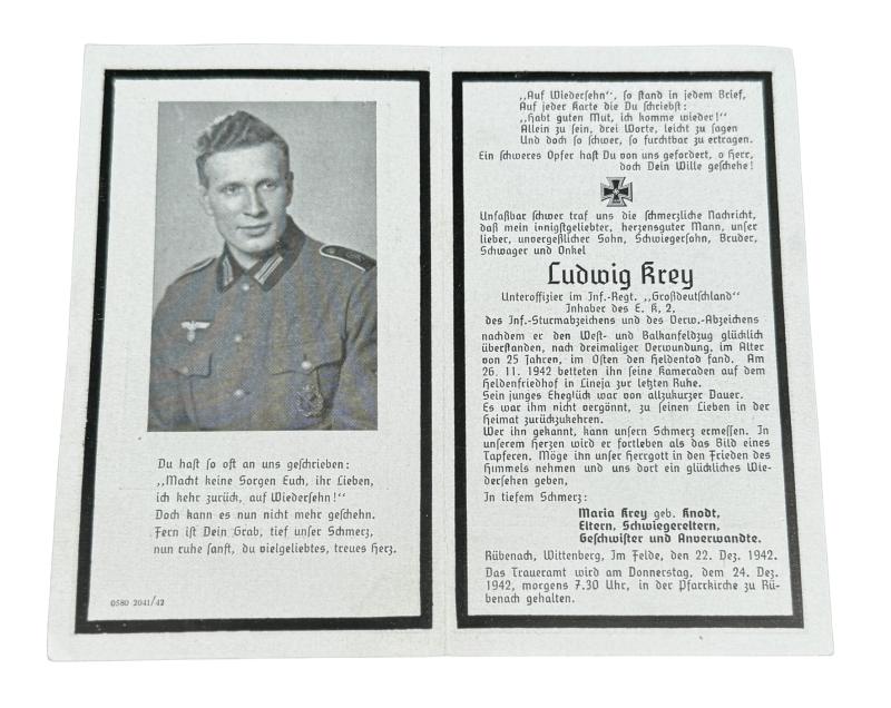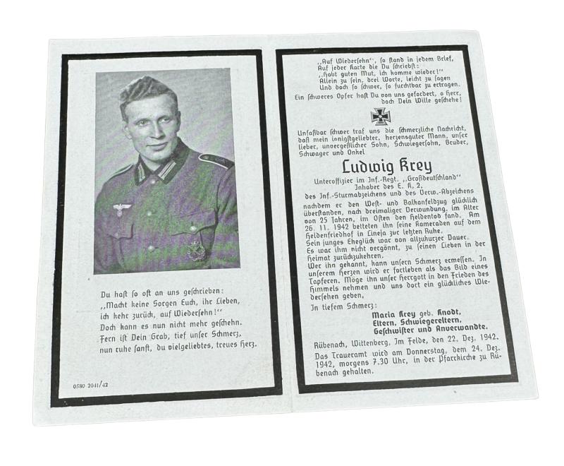 Death notice of Wehrmacht NCO (Unteroffizier) “Ludwig Krey” recipient of the “Iron Cross second class “1939”, woundbadge and Infantry Assault badge” KIA “Oktober 26, 1942” serving in the famous infantry regiment “Gross Deutschland Division”
