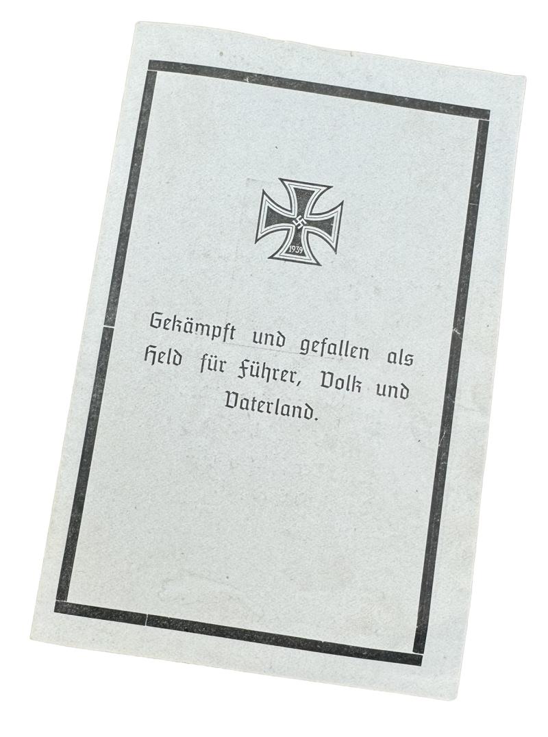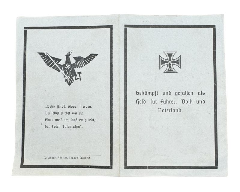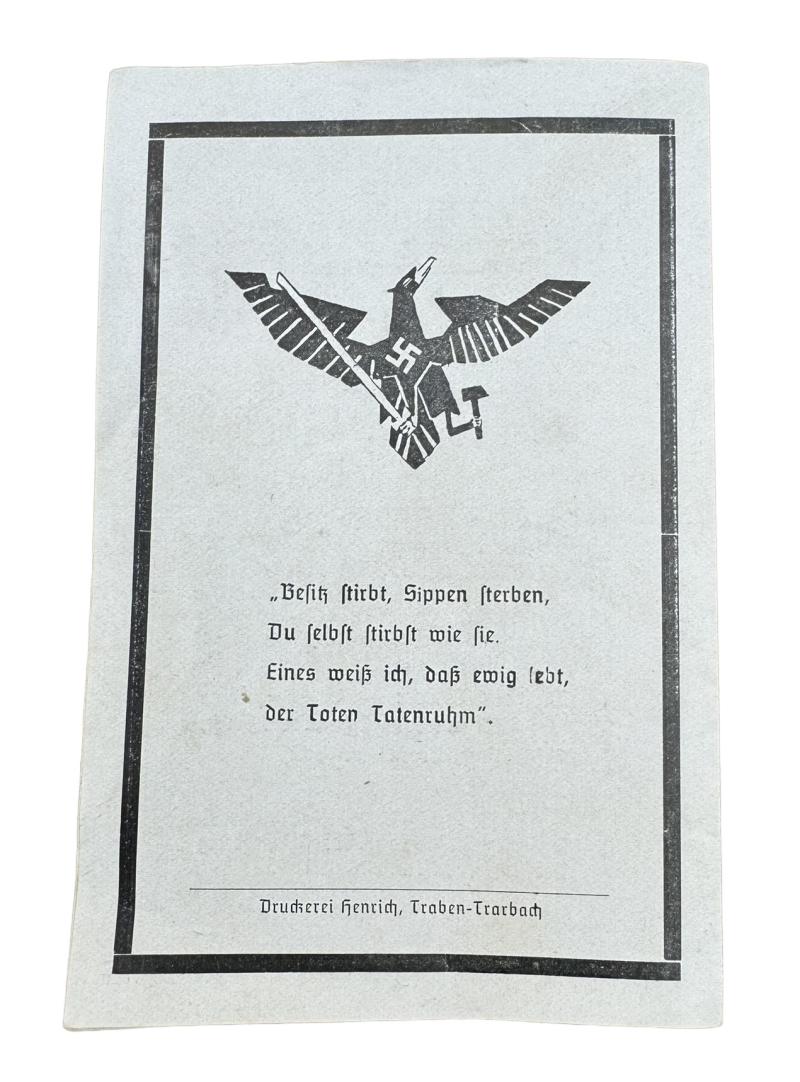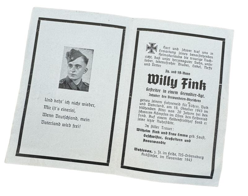 Death notice of Wehrmacht Pz. Grenadier and SA man, “Willy Fink” recipient of the wound badge black.