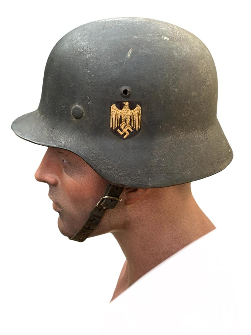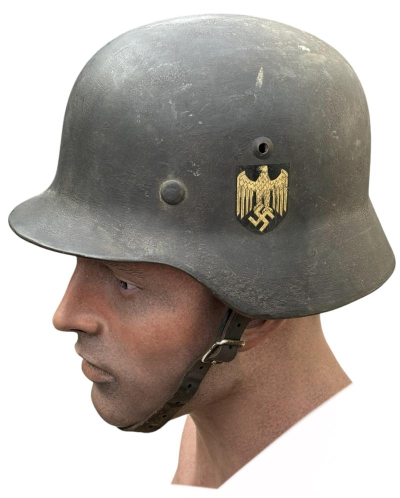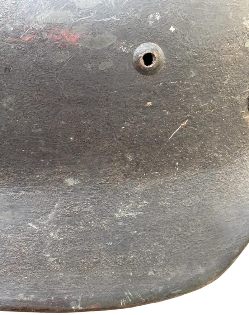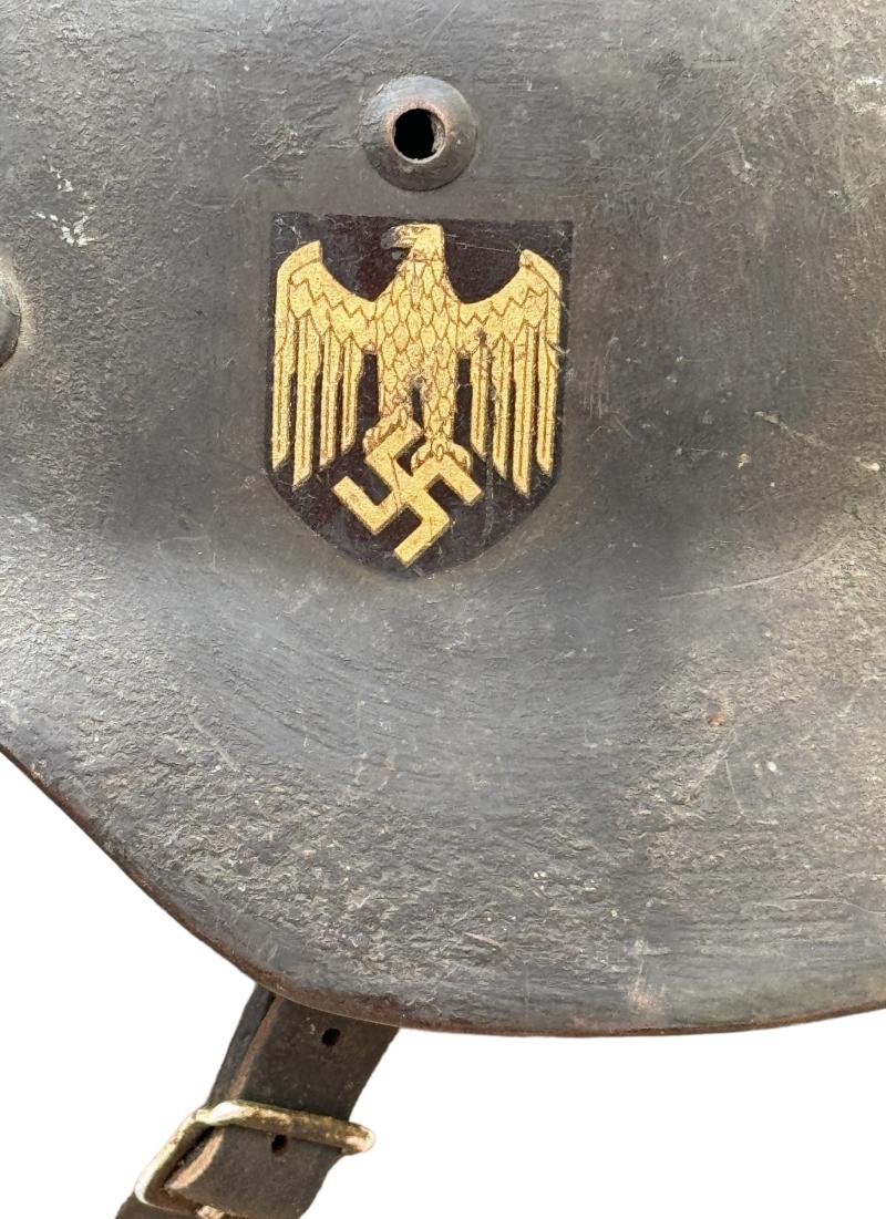 Second decal is under the new layer of structure camo paint. Overal a very nice untouched Wehrmacht M35 SD helmet in used but in very good condition.